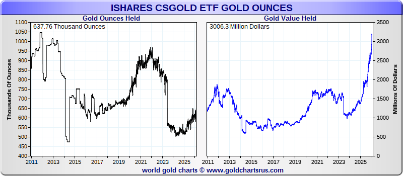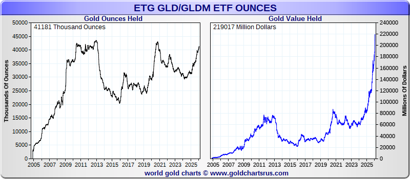 | XetraGold | 5,566,656 oz | $ 29,605,703,270 | 0 oz | 2,572 oz | 0.05 % | ||||||
