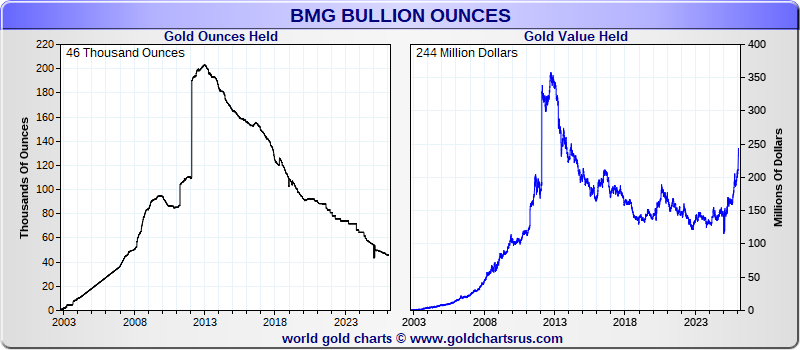 | BMG Bullion | 45,853 oz | $ 243,864,595 | 0 oz | -224 oz | -0.49 % | ||||||