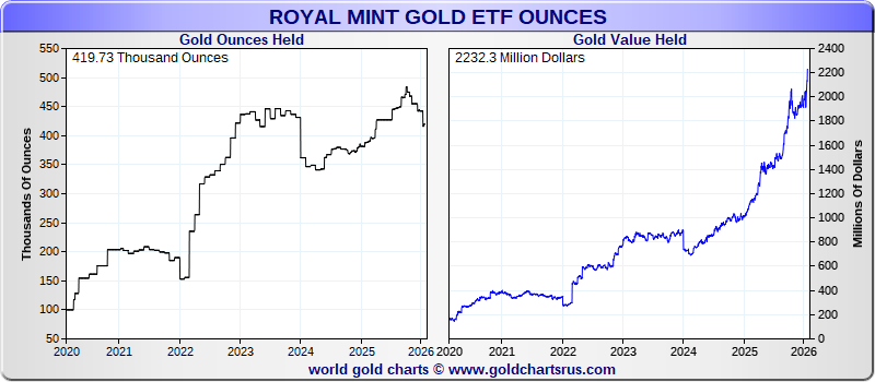 | Royal Mint | 419,733 oz | $ 2,232,307,987 | 0 oz | -22,627 oz | -5.12 % | ||||||