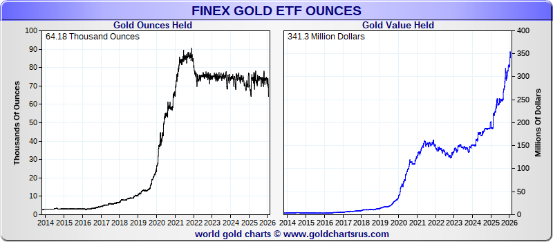| FinEx Gold | 64,180 oz | $ 341,334,912 | -2,316 oz | -9,937 oz | -13.41 % | ||||||