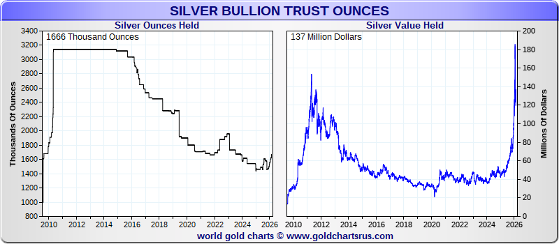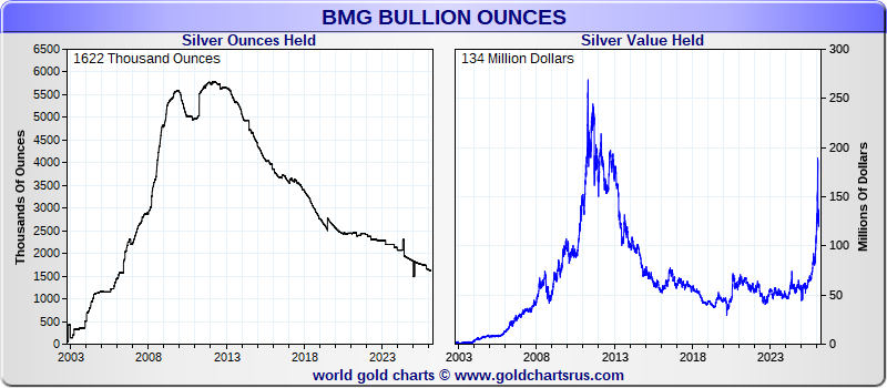 | BMG Bullion | 1,622,070 oz | $ 133,561,244 | -1,052 oz | -14,850 oz | -0.91 % | ||||||