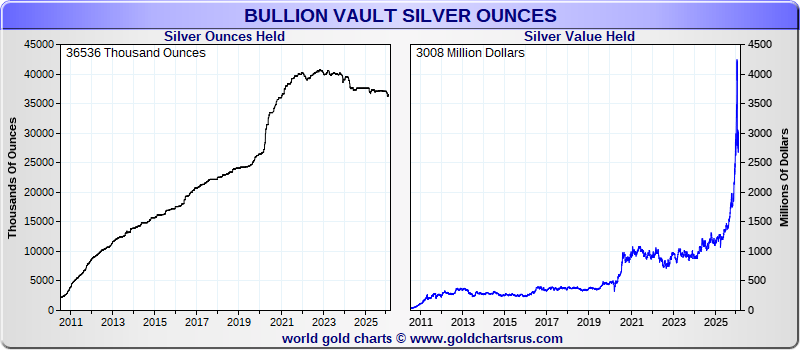 | BullionVault | 36,536,214 oz | $ 3,008,391,861 | 129,221 oz | -232,446 oz | -0.63 % | ||||||