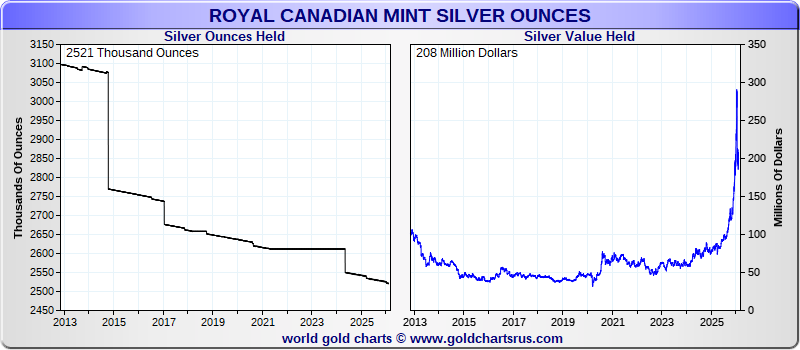 | Canadian Mint | 2,521,288 oz | $ 207,602,854 | -218 oz | -871 oz | -0.03 % | ||||||