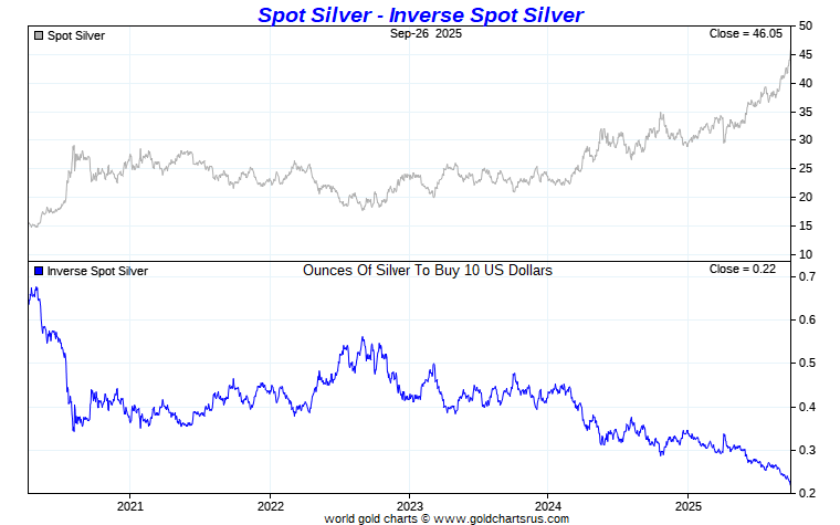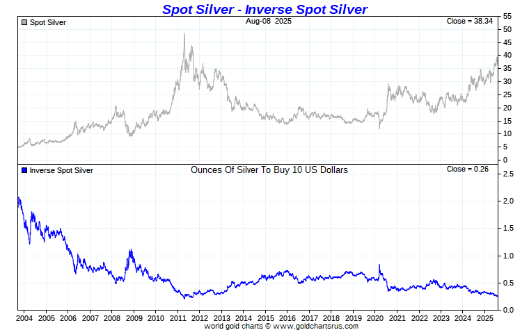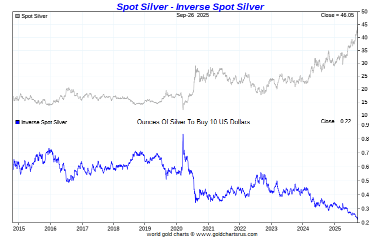 The inverse price of the metal shows us how many ounces it would take to buy 10 US Dollars.