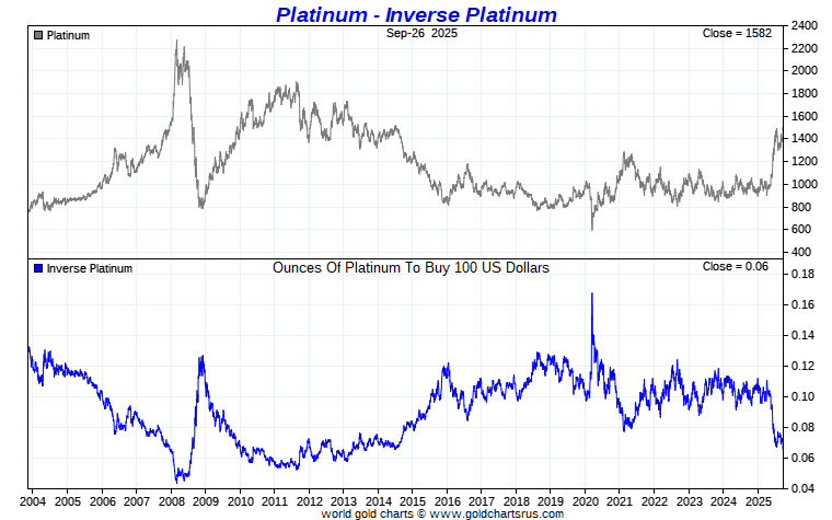The inverse price of the metal shows us how many ounces it would take to buy 100 US Dollars.