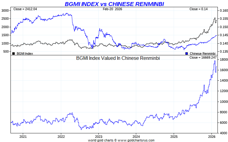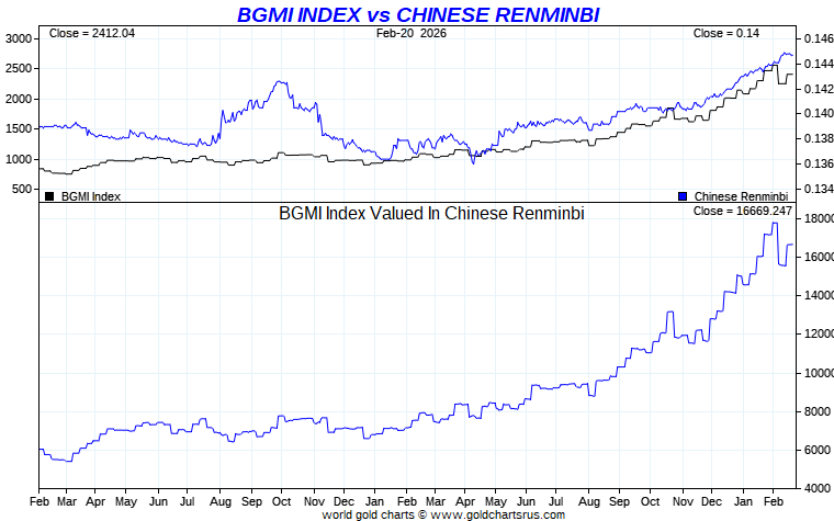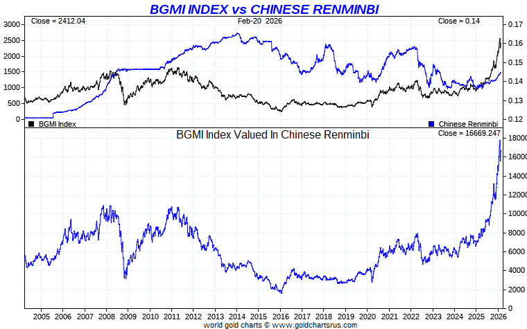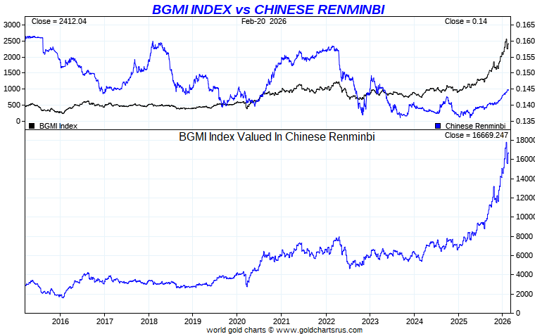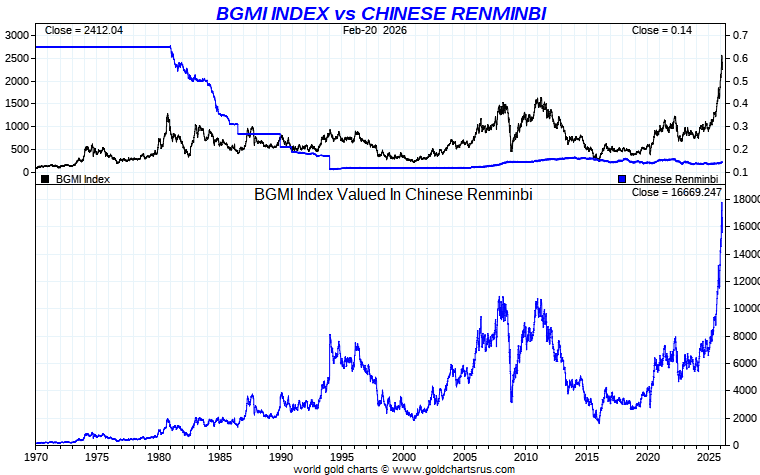 Barron's Gold Mines Index vs Global Currency - Chinese Renminbi