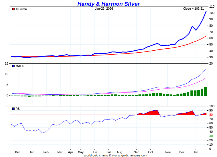 Barron's Gold Mining Index - Handy & Harmon Gold Price - Handy & Harmon Silver Price