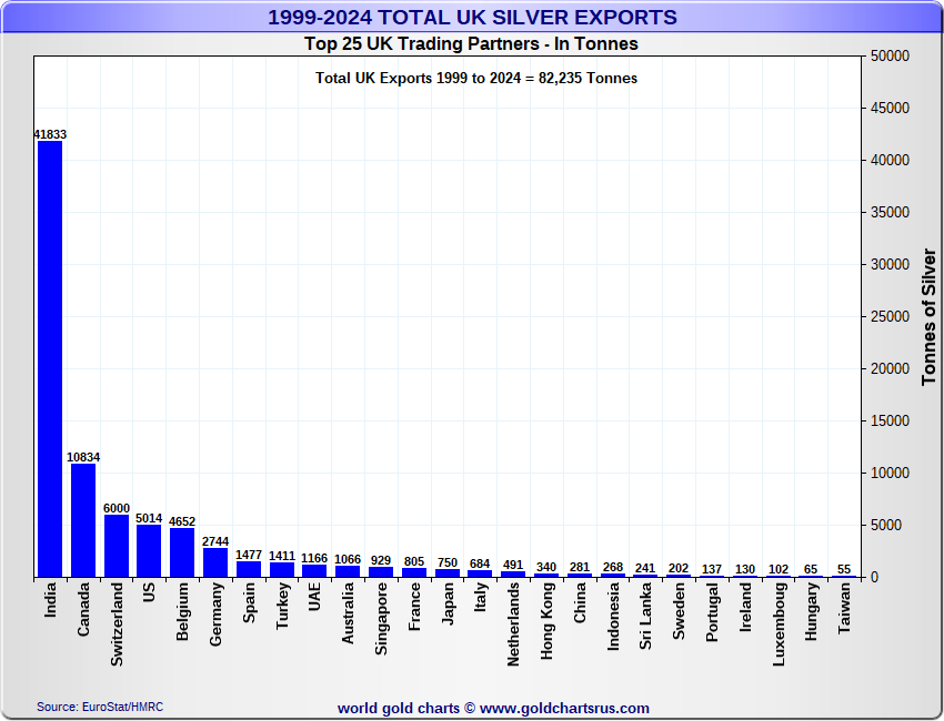 Tonnages are derived from GBP values divided by the GBP silver price. Source: UK Trade |