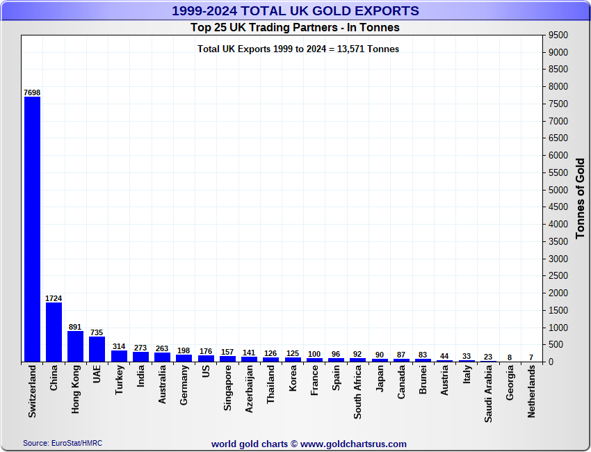 Tonnages are derived from GBP values divided by the GBP gold price. Source: UK Trade |