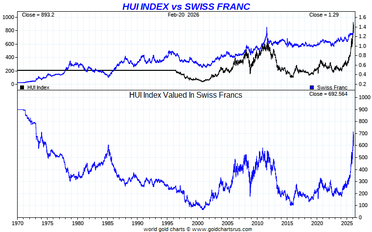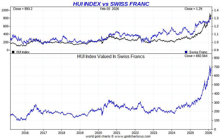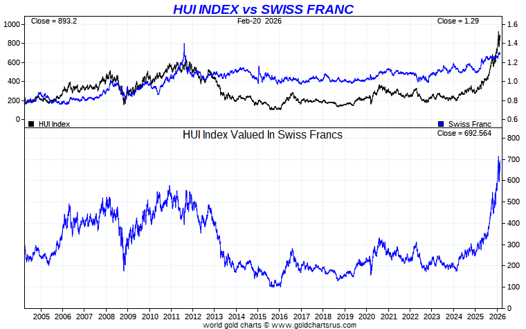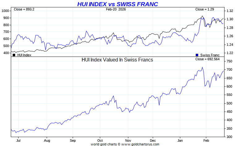 HUI Index vs Global Currency - Swiss Franc