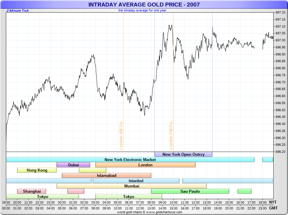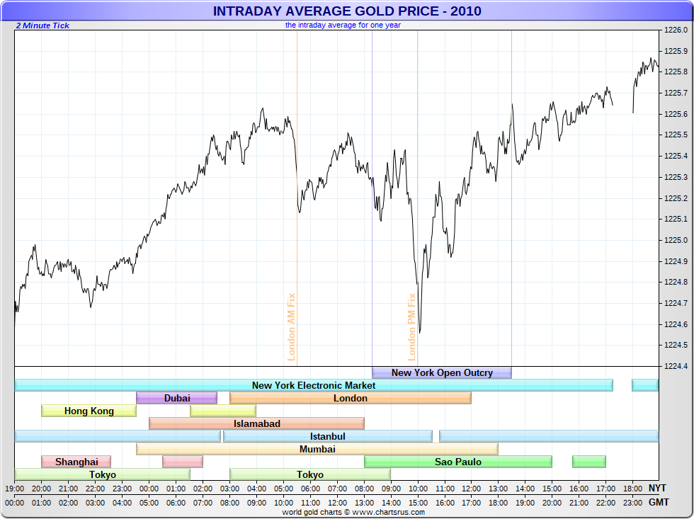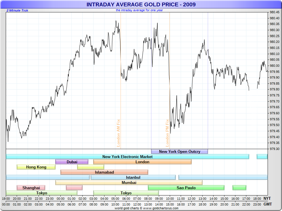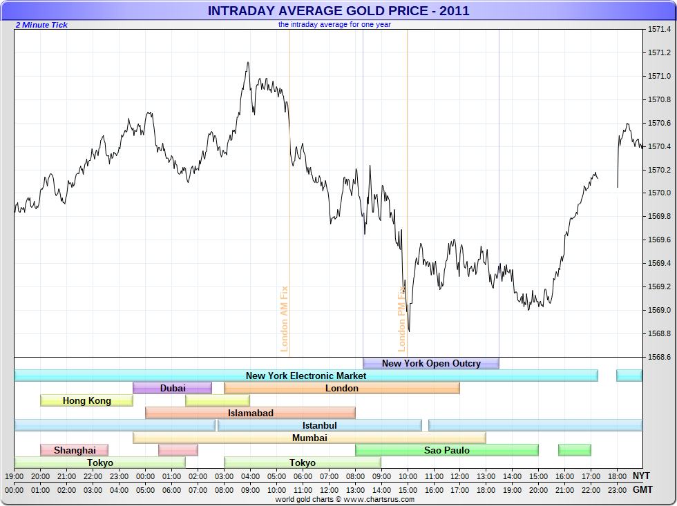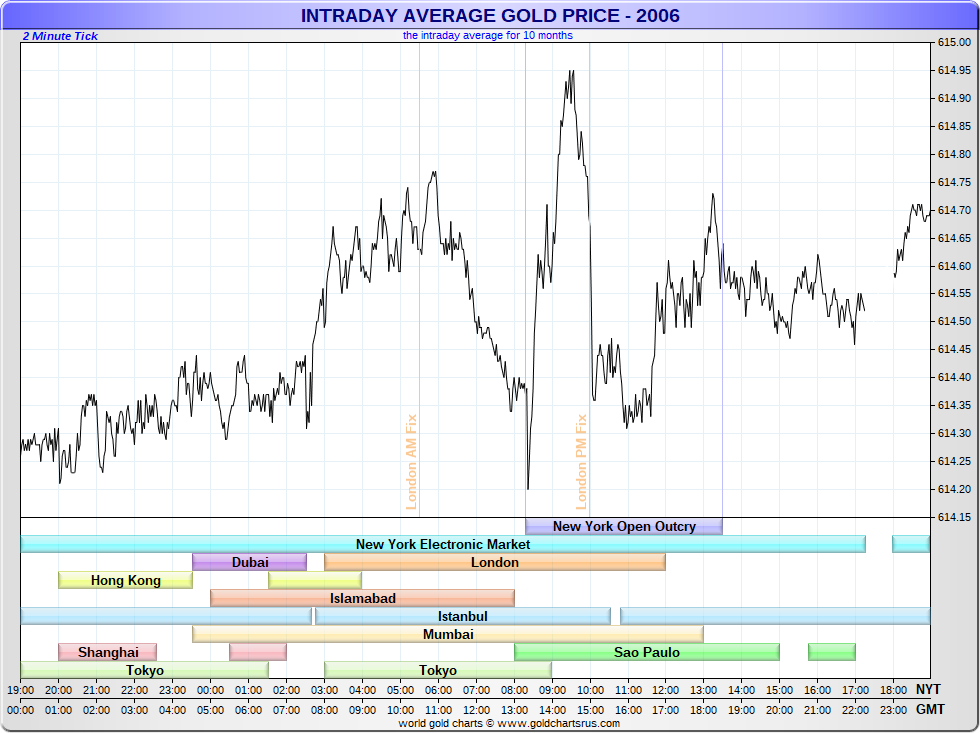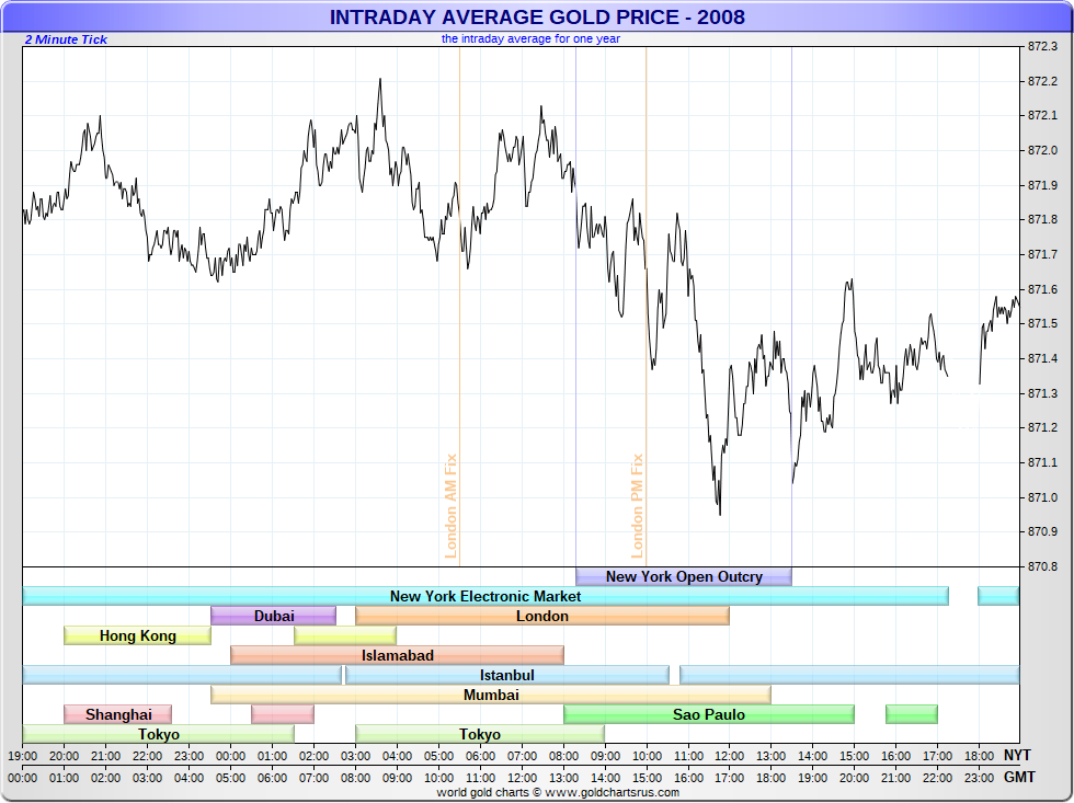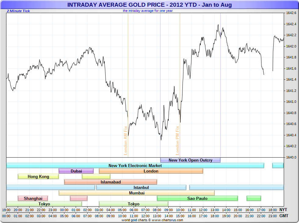 The price plot on the top half of the charts shows the intraday average for the last 6.5 years - a 2 minute tick 24 hours a day from March 2006 to August 2012. Approximately 1700 days all averaged so as to find any impositions on the price plot. Further below you can see the individual months & years laid out. Here you can see many random months where the markets can be rising, steady or falling but through all the clutter are the outstanding slides on each of the London fixes. These are the times when the greatest manipulation takes place. Gold is now traded around the clock on electronic trading as well as open outcry. Demand is active all hours of the day across the globe. Of note is that the active manipulation at 10:00am NYT coinciding with the London Fix (3:00pm GMT) is the same as seen here in an earlier study. The bottom half of the plot shows the countries with trading exchanges that settle their futures contracts in physical as well as cash. These trading exchanges are the world's major trading exchanges that add to price discovery around the clock. They trade in volume & delivery to such an extent that they add to the price discovery that goes on 24 hours a day around the globe. There are plenty of other exchanges offering cash settlement only futures but generally their volumes are low & it's likely that most of these exchanges add little to the price discovery. Singapore, Sydney & Zurich have all stopped trading gold futures & now deal OTC for clients and as such are no longer included as they don't offer price discovery. |