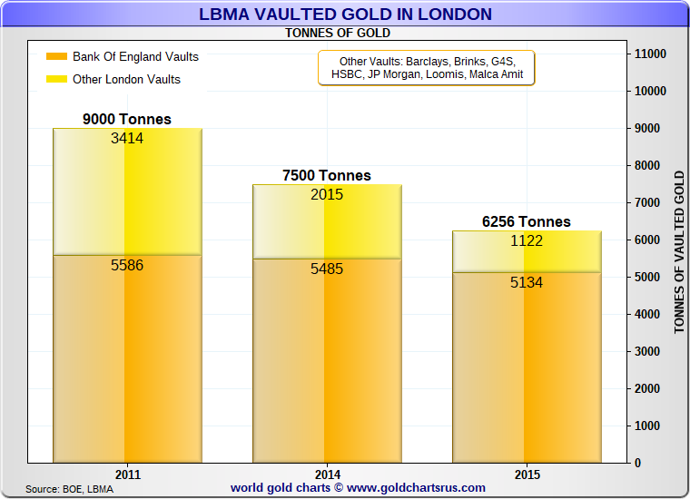 - The third reference (June 2015 - page 19) is that there are/were 500,000 bars worth 237 billion left in the London vaults = approx 6256 tonnes.