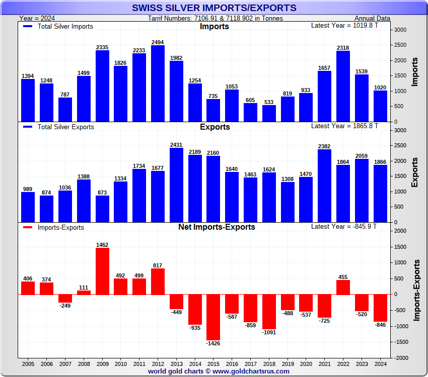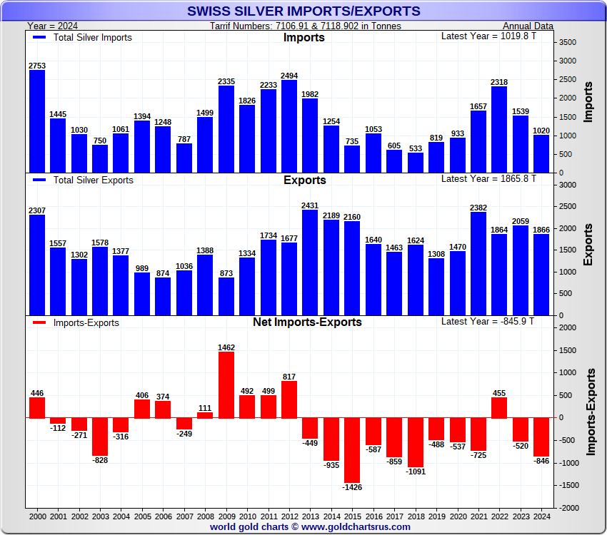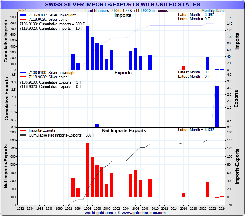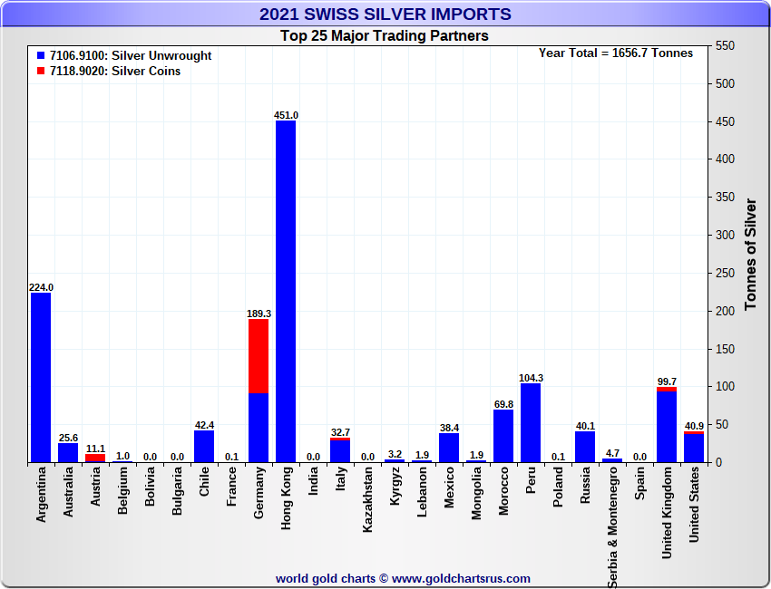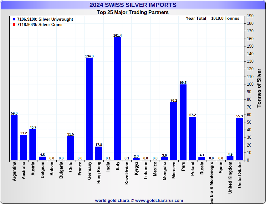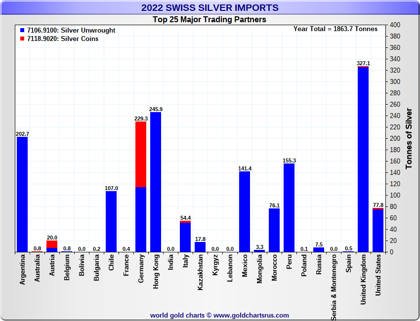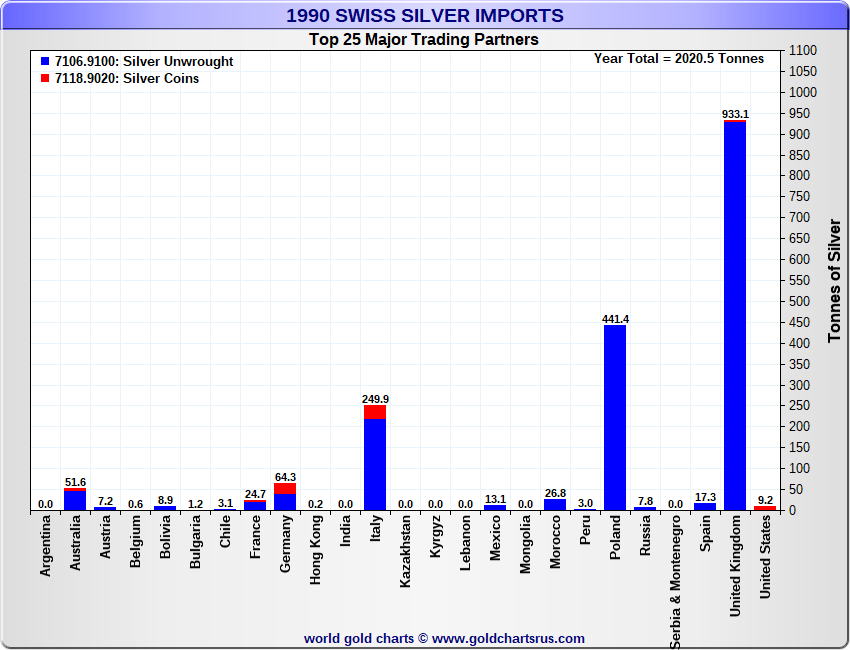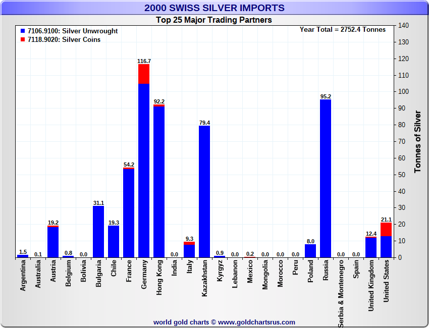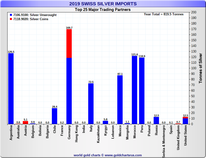 Tonnages are derived from CHF values divided by the CHF silver price. Source: Swiss Data |