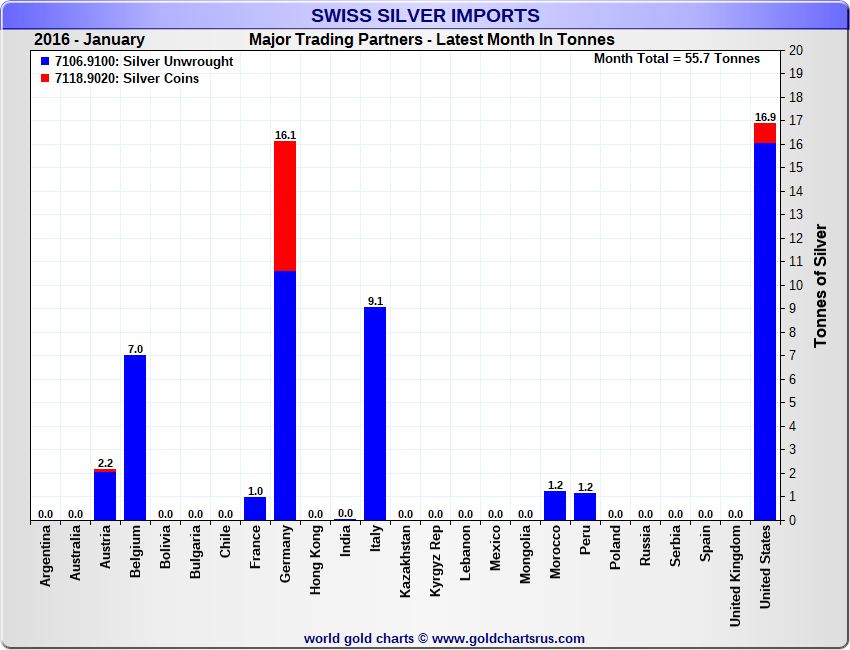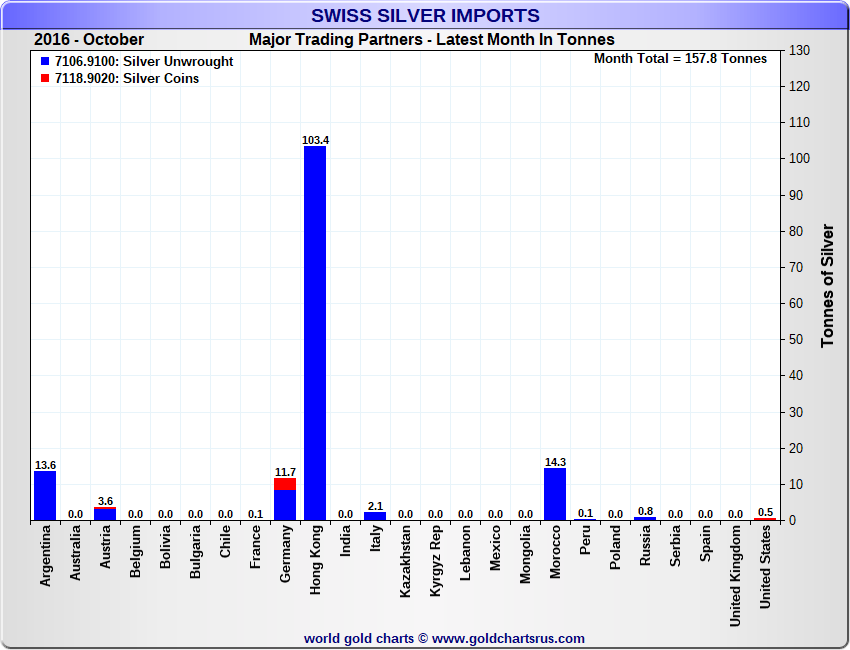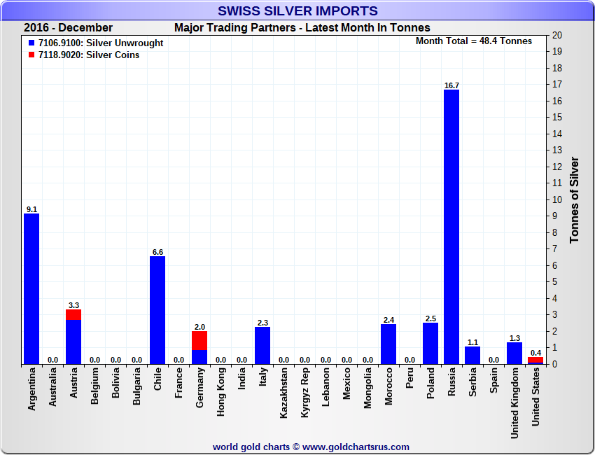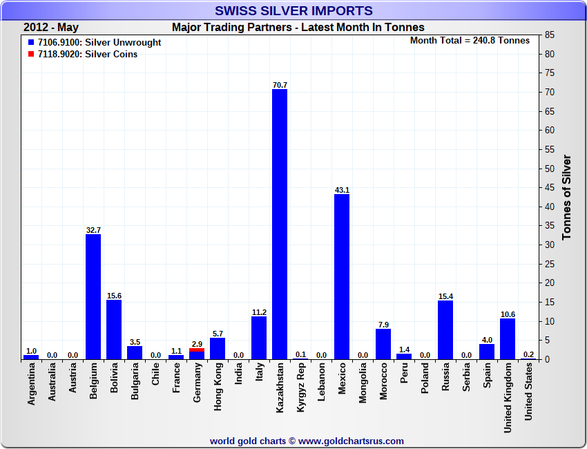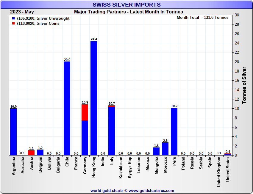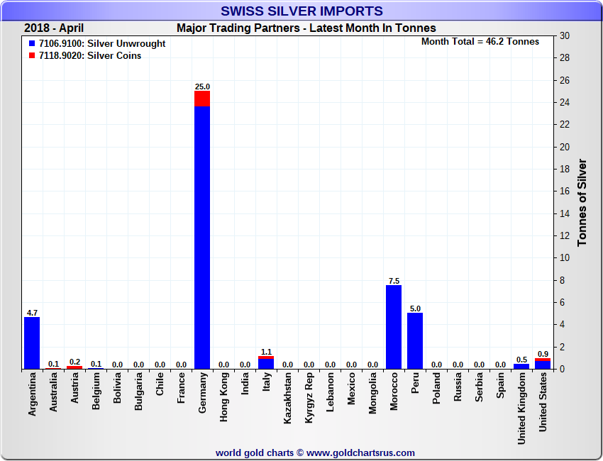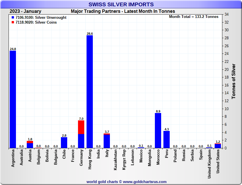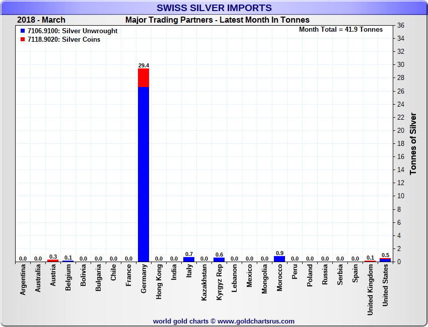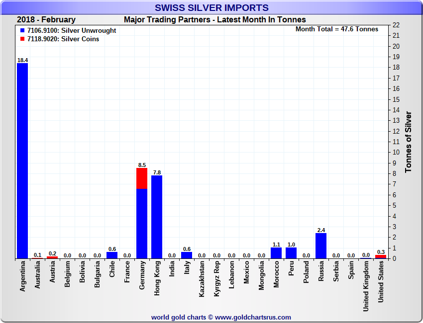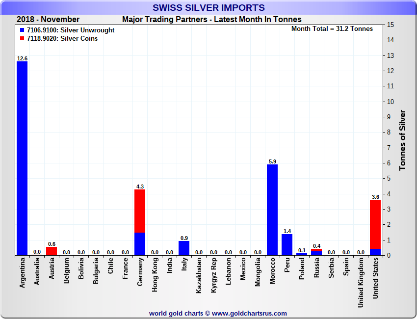 Tonnages are derived from CHF values divided by the CHF silver price. Source: Swiss Data |