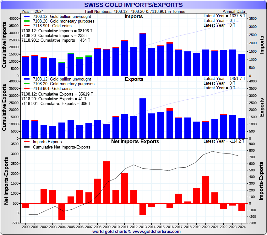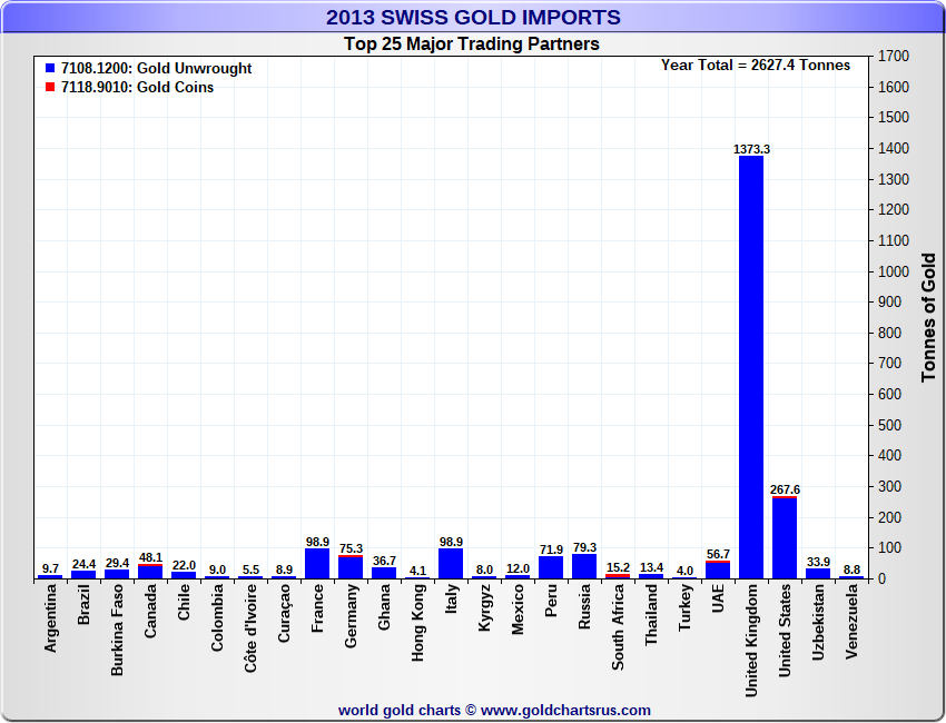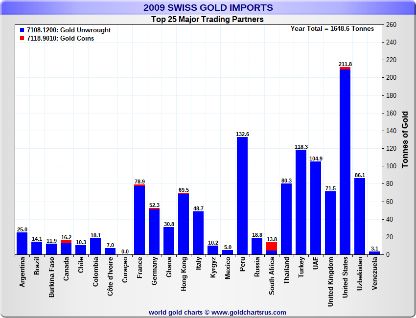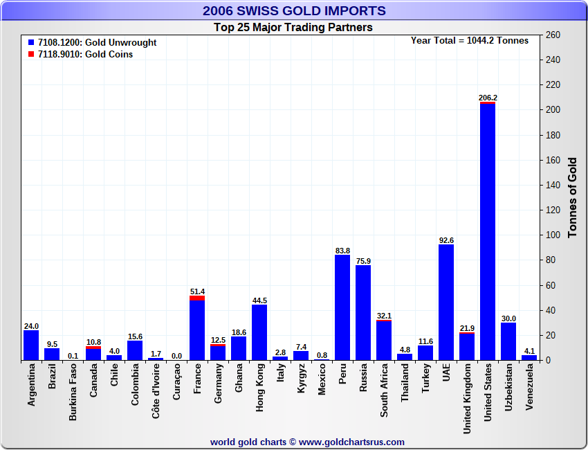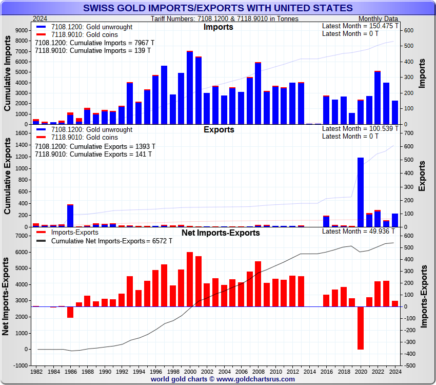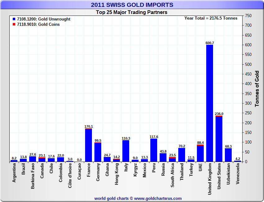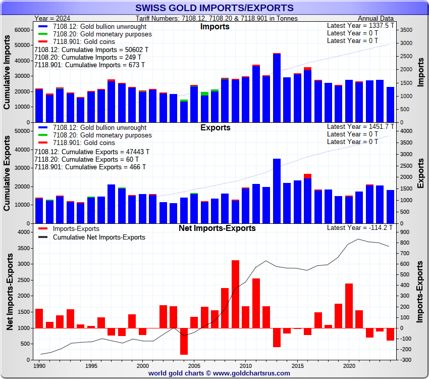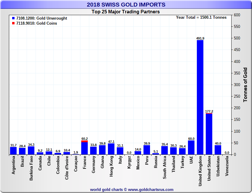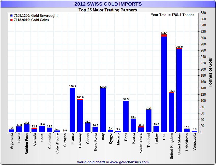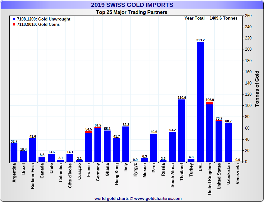 Tonnages are derived from CHF values divided by the CHF gold price. Source: Swiss Data |