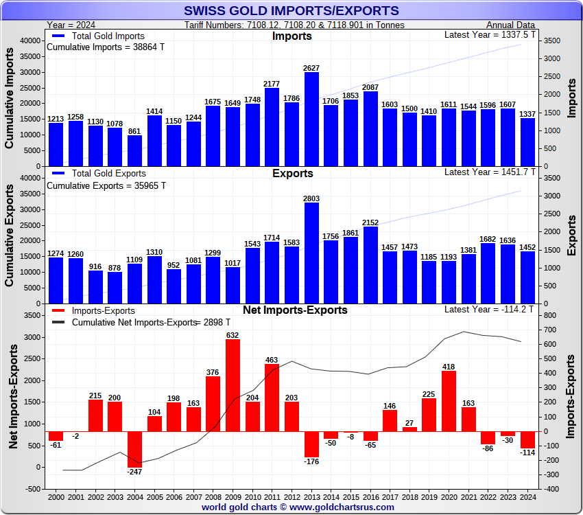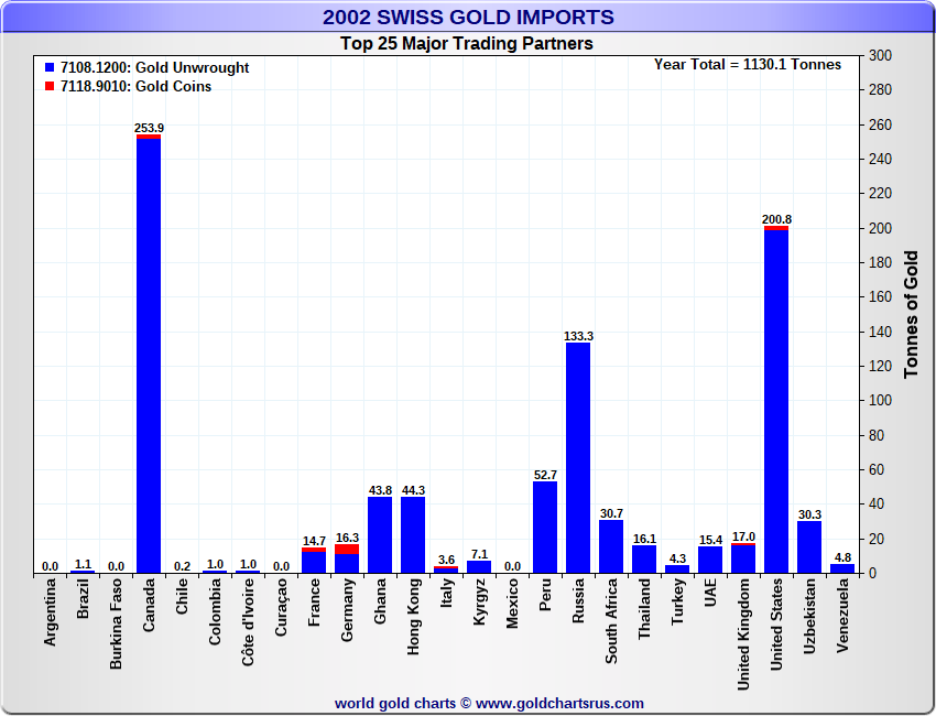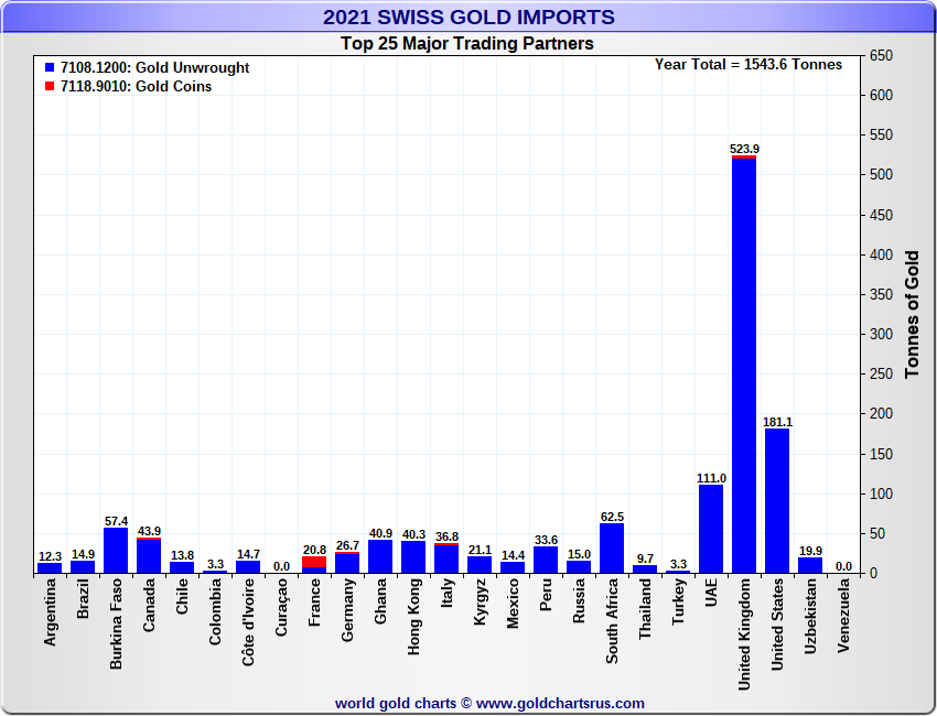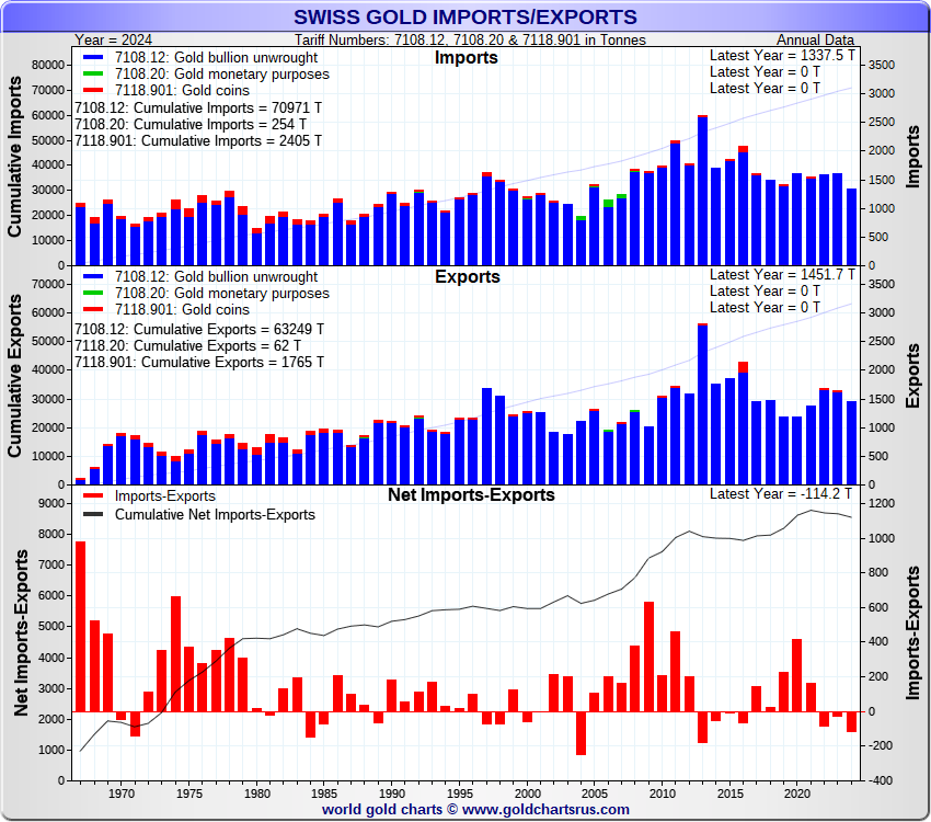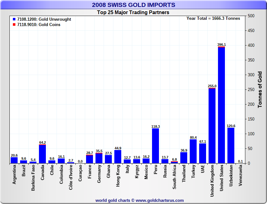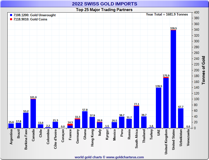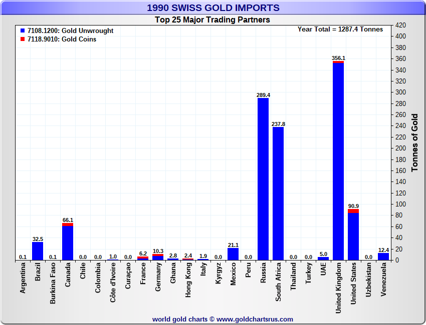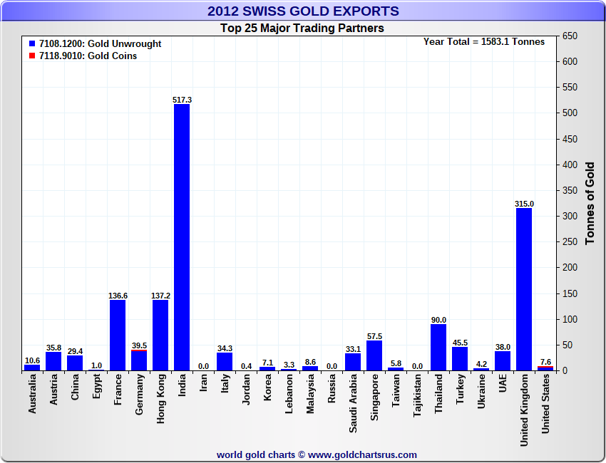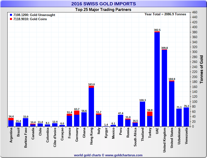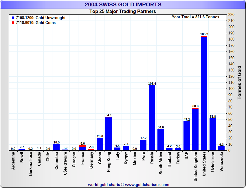 Tonnages are derived from CHF values divided by the CHF gold price. Source: Swiss Data |