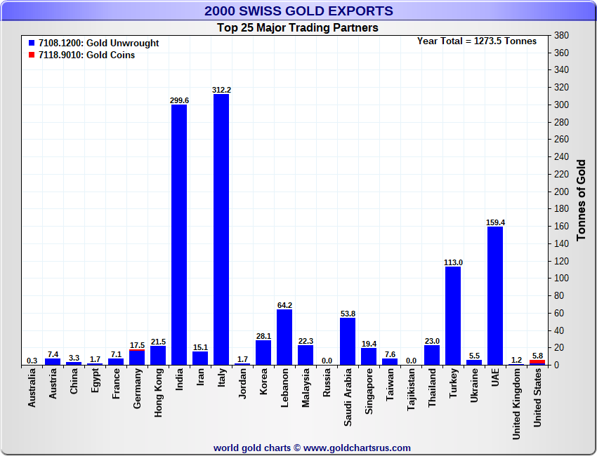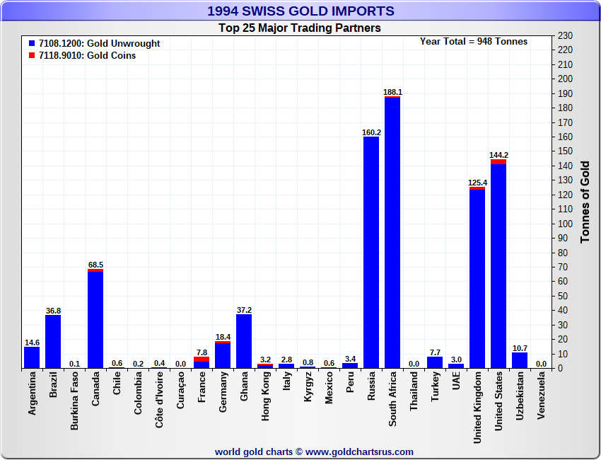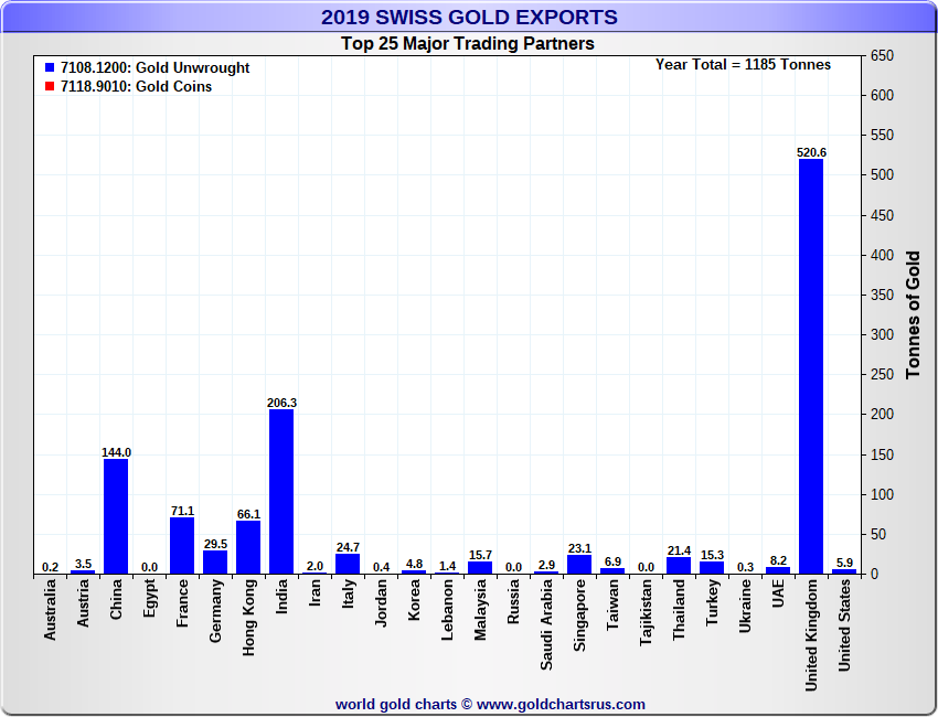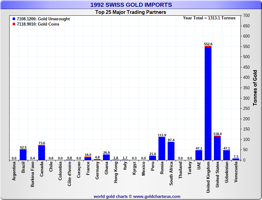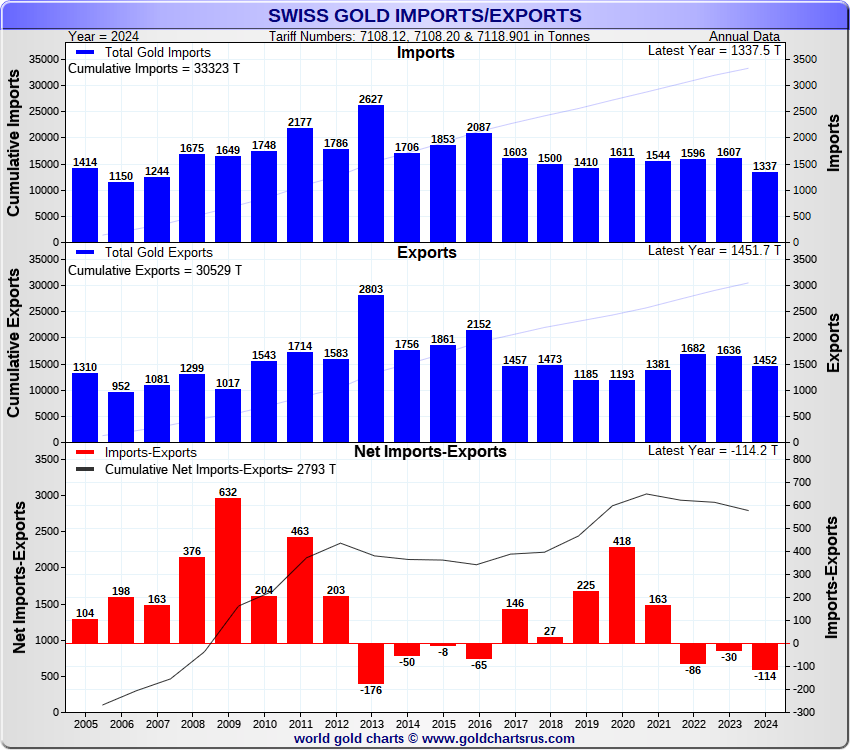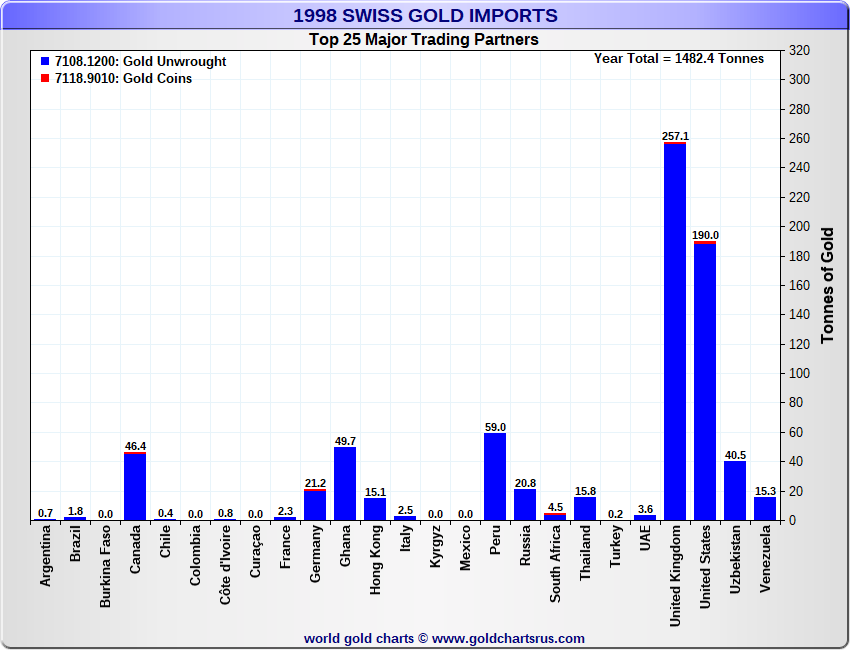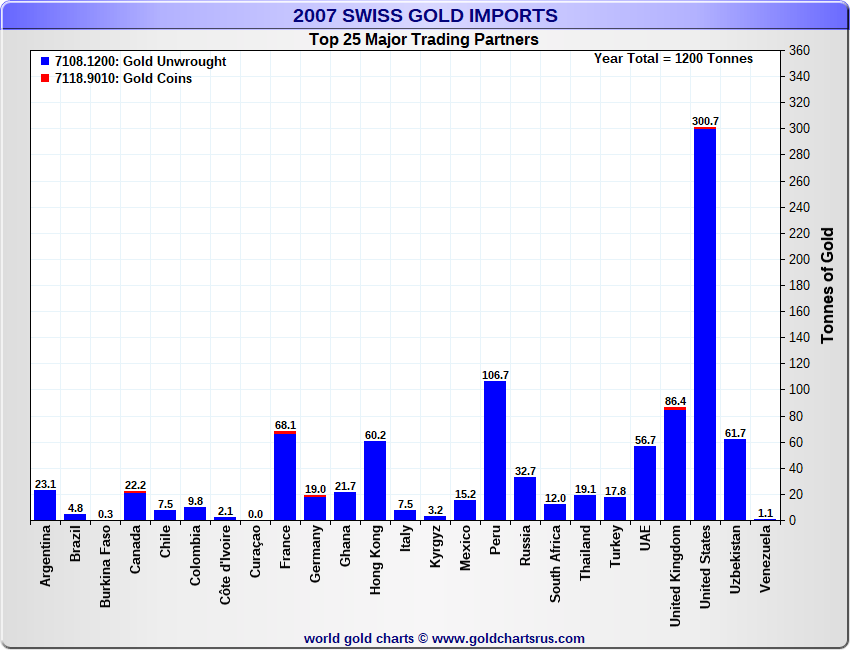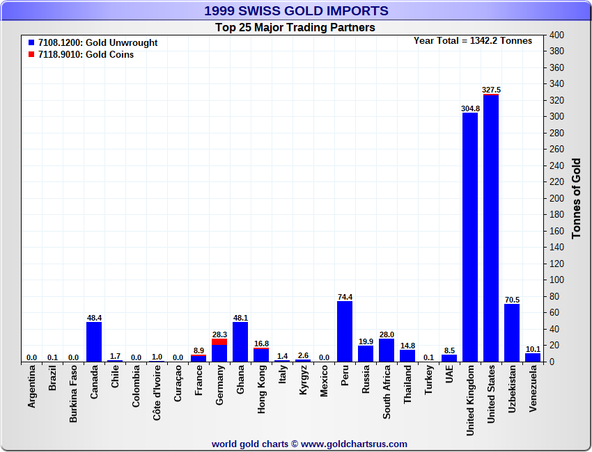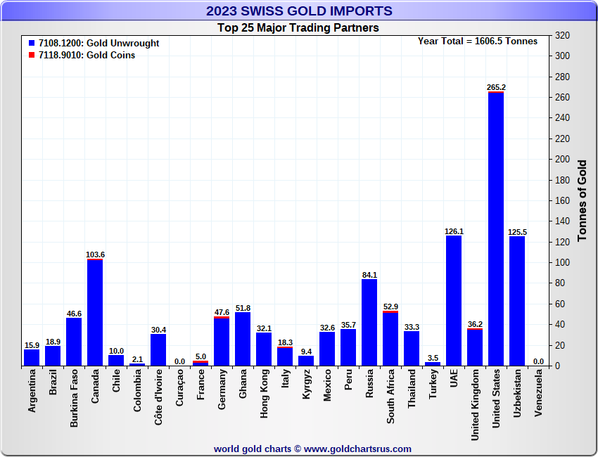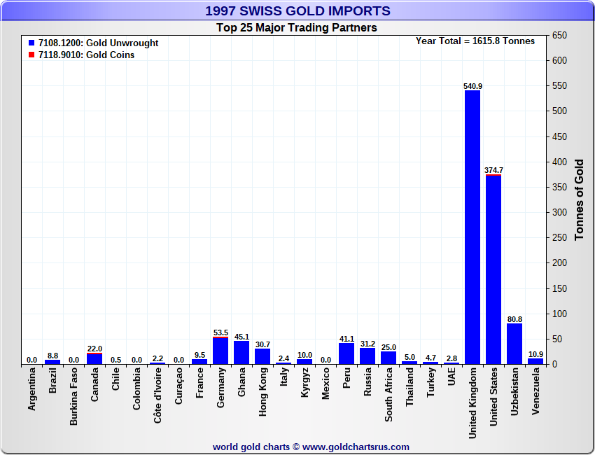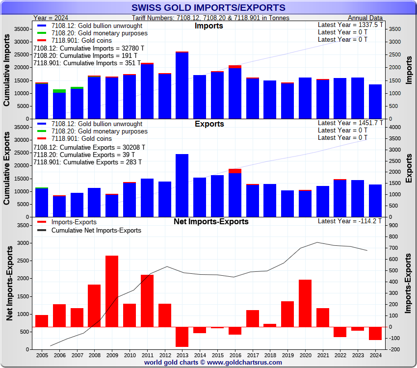 Tonnages are derived from CHF values divided by the CHF gold price. Source: Swiss Data |