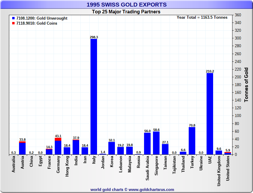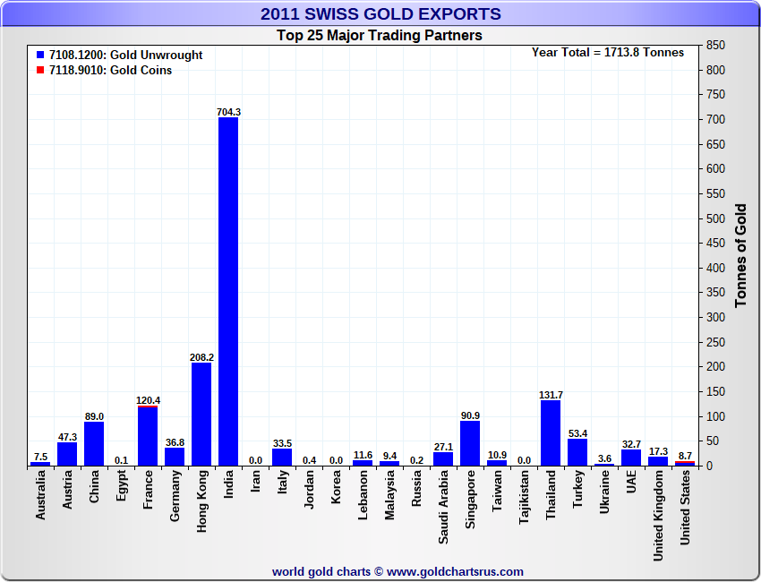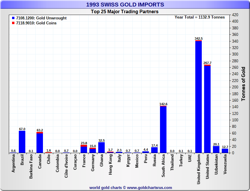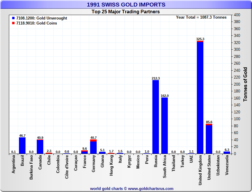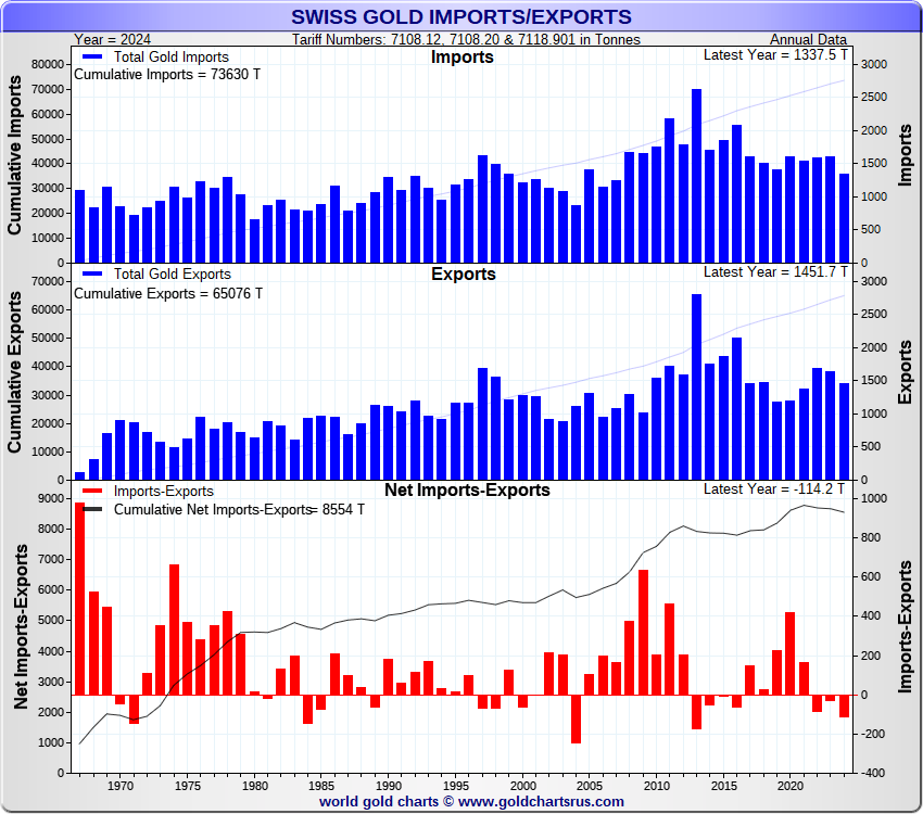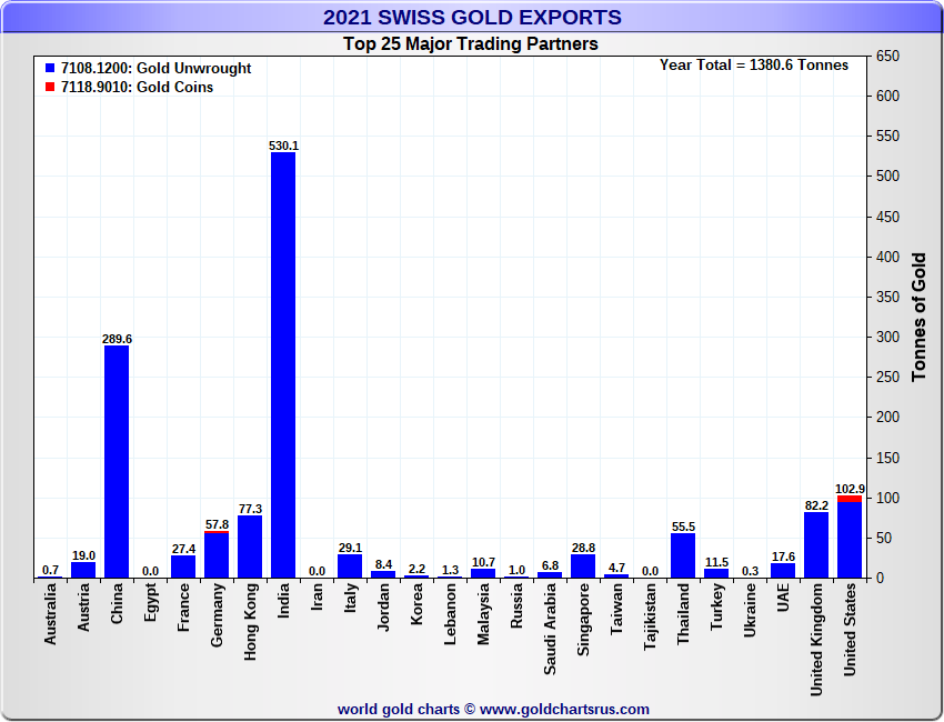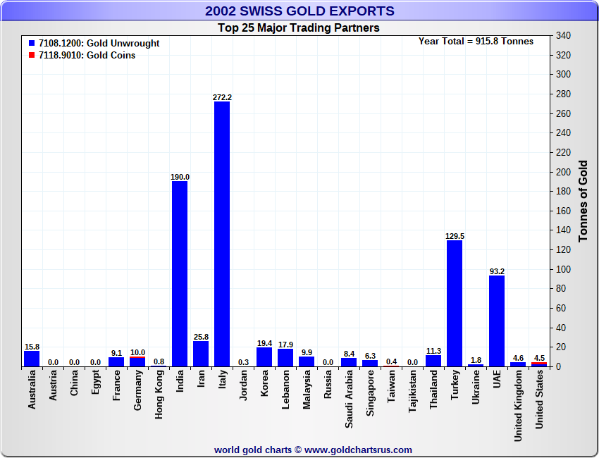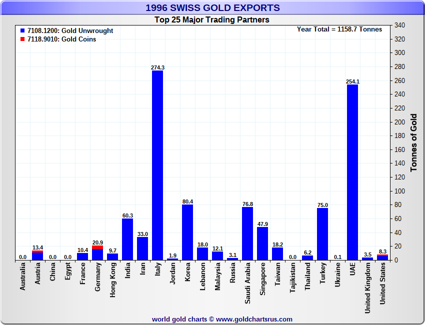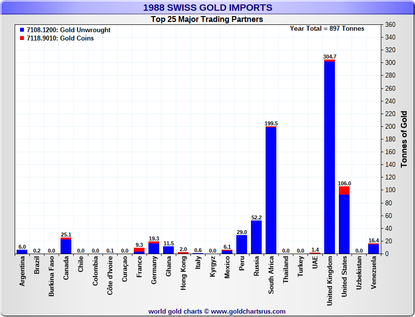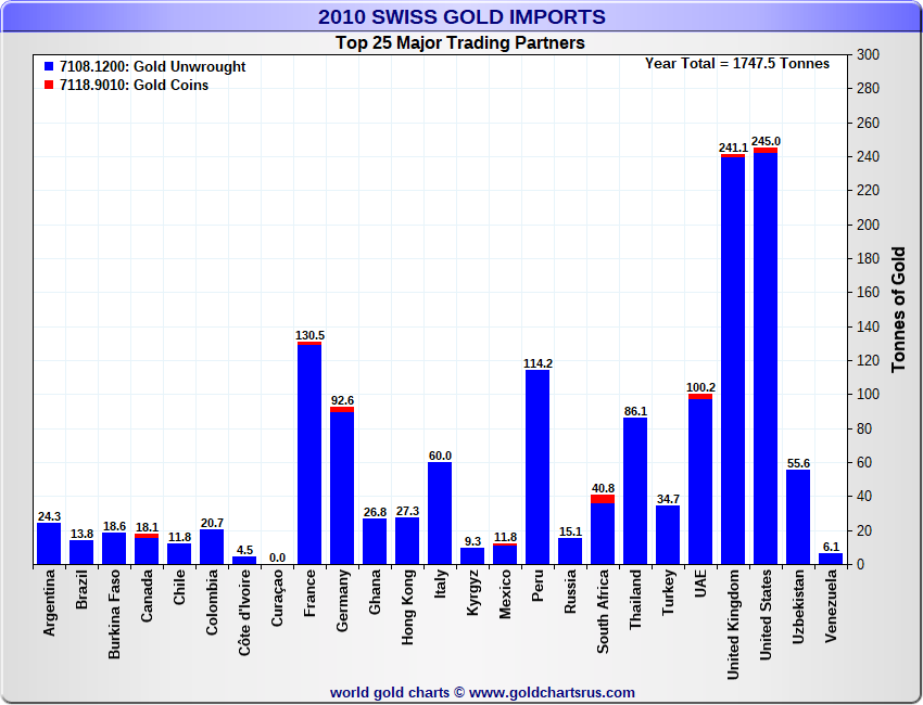 Tonnages are derived from CHF values divided by the CHF gold price. Source: Swiss Data |