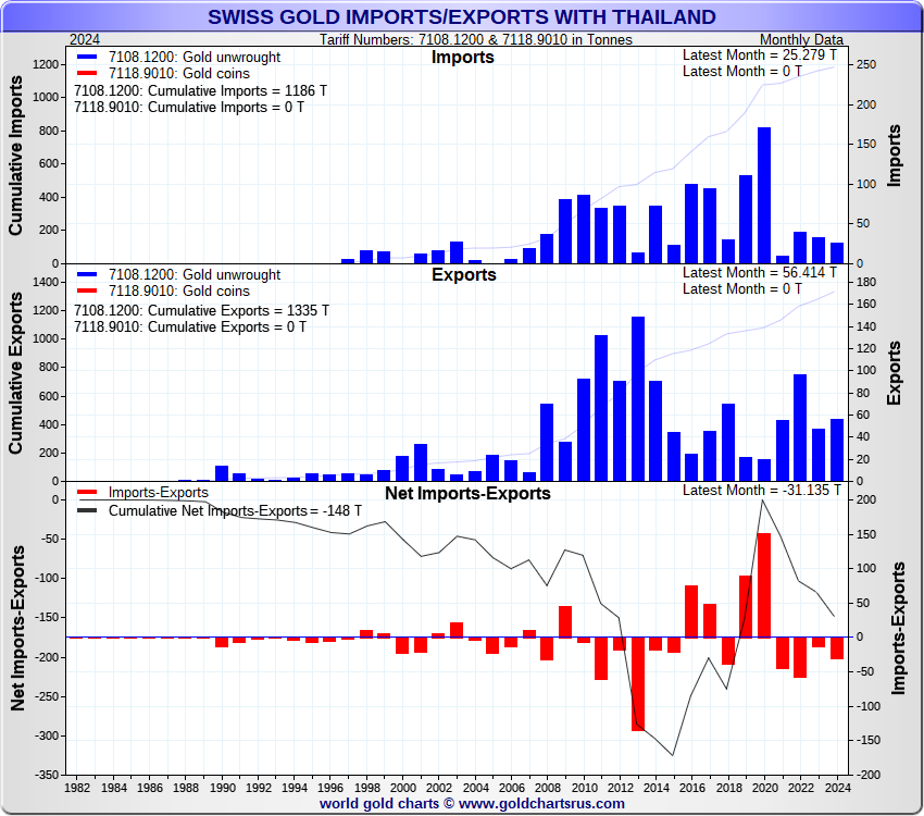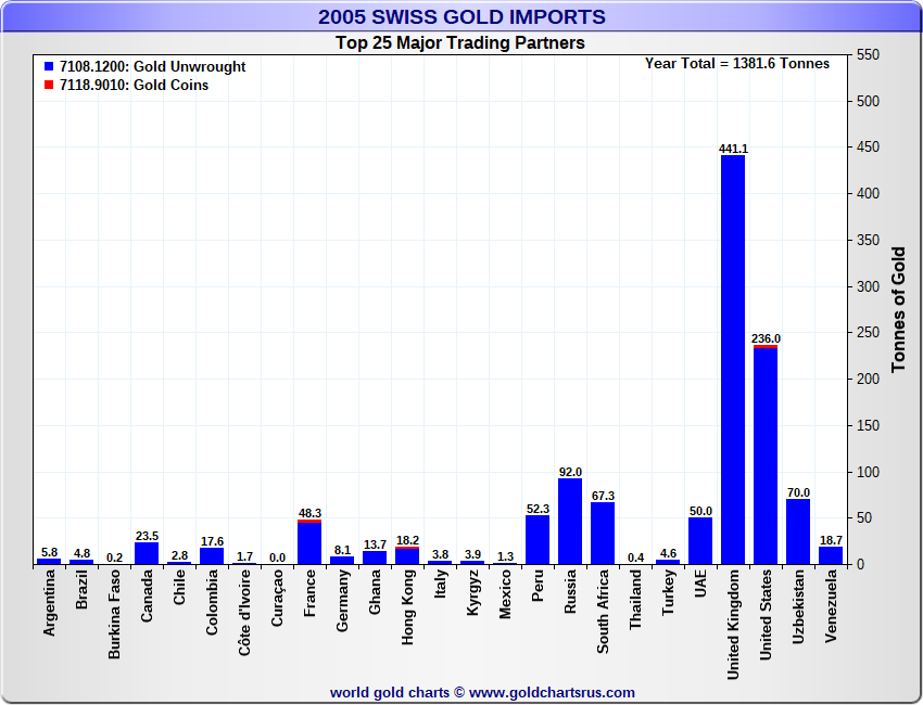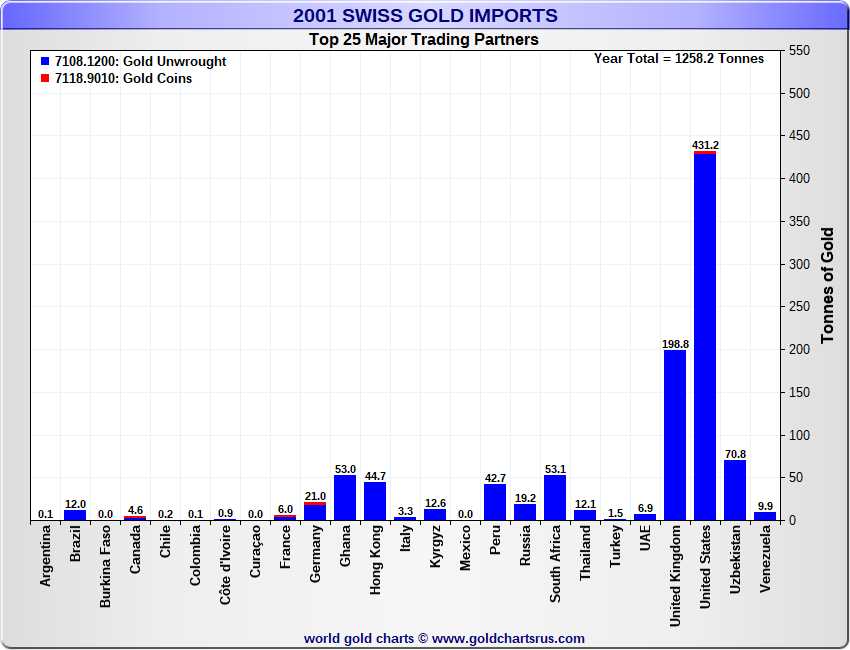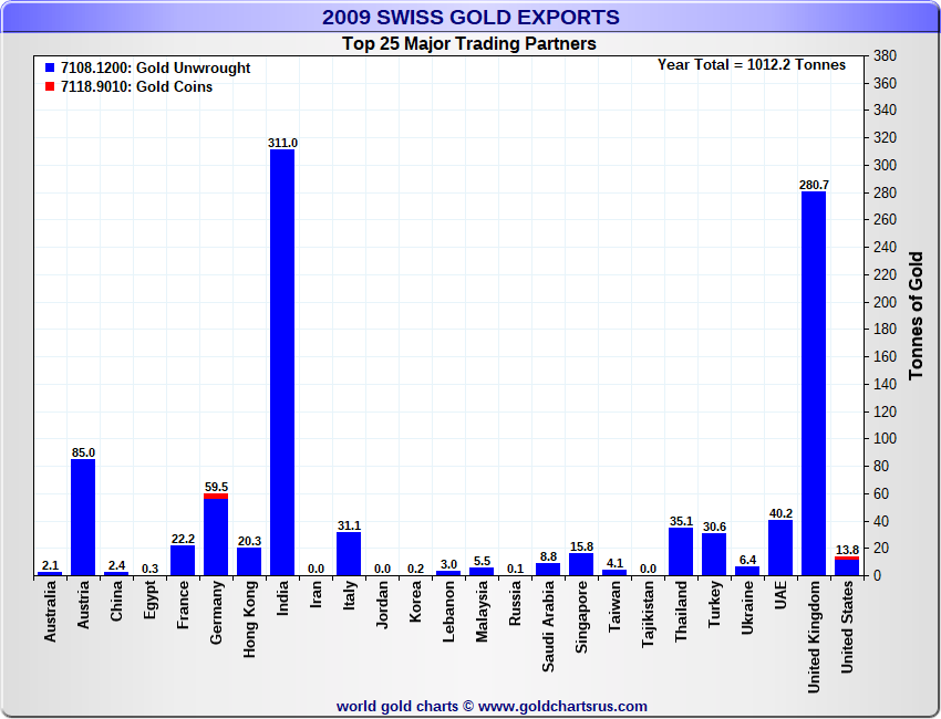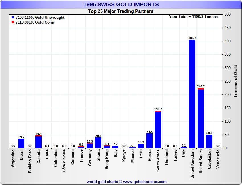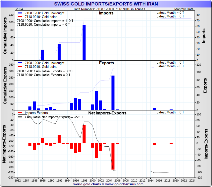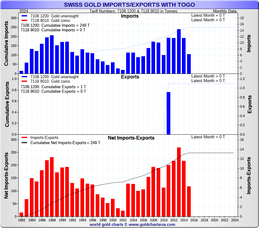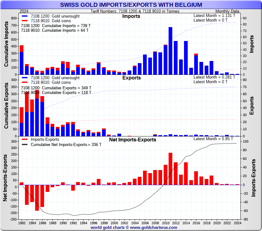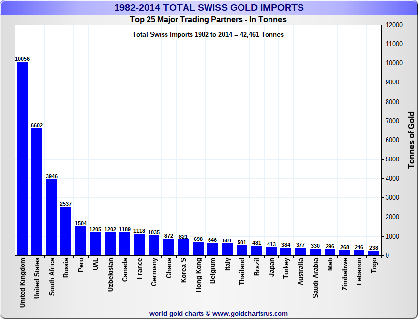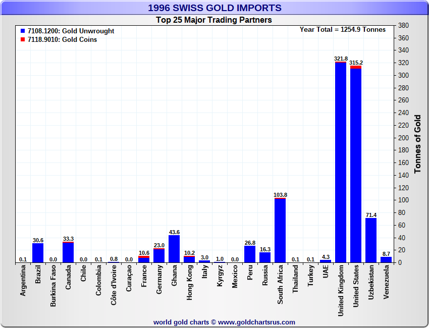 Tonnages are derived from CHF values divided by the CHF gold price. Source: Swiss Data |