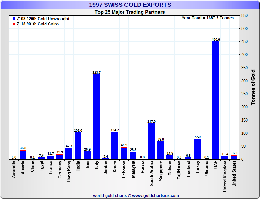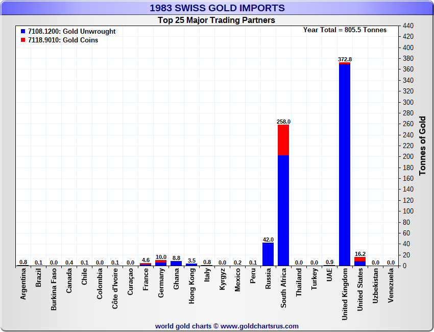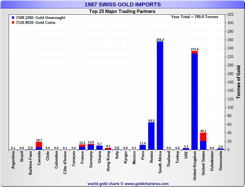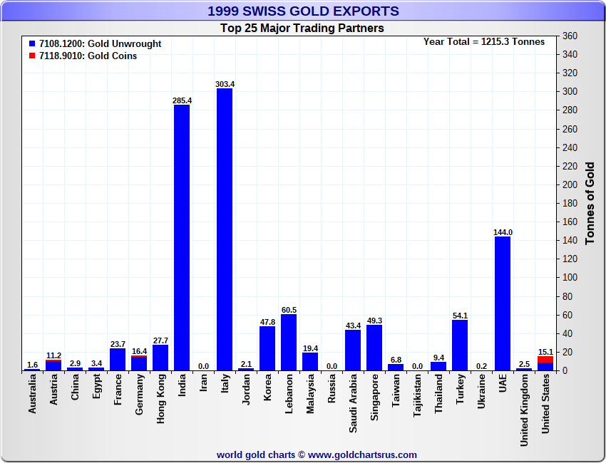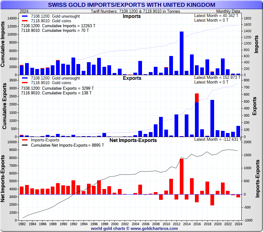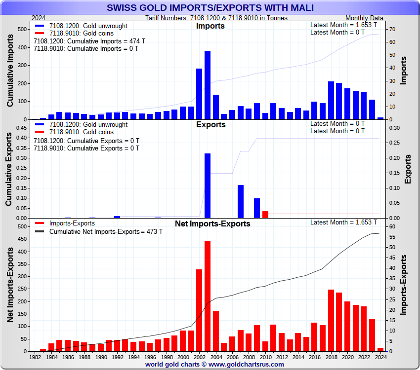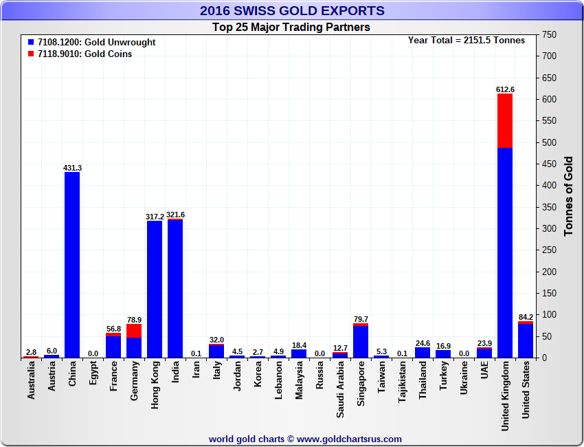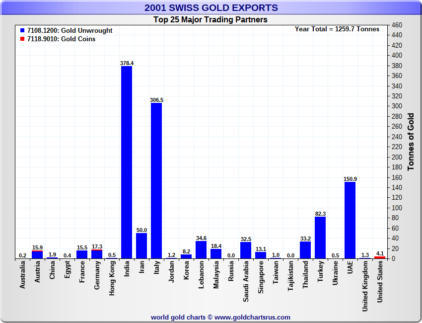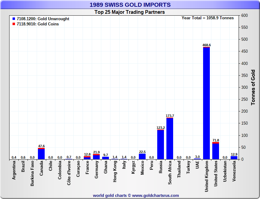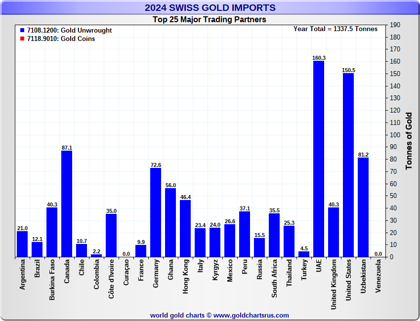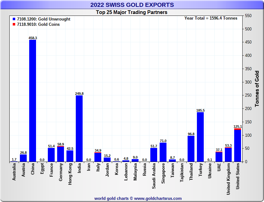 Tonnages are derived from CHF values divided by the CHF gold price. Source: Swiss Data |