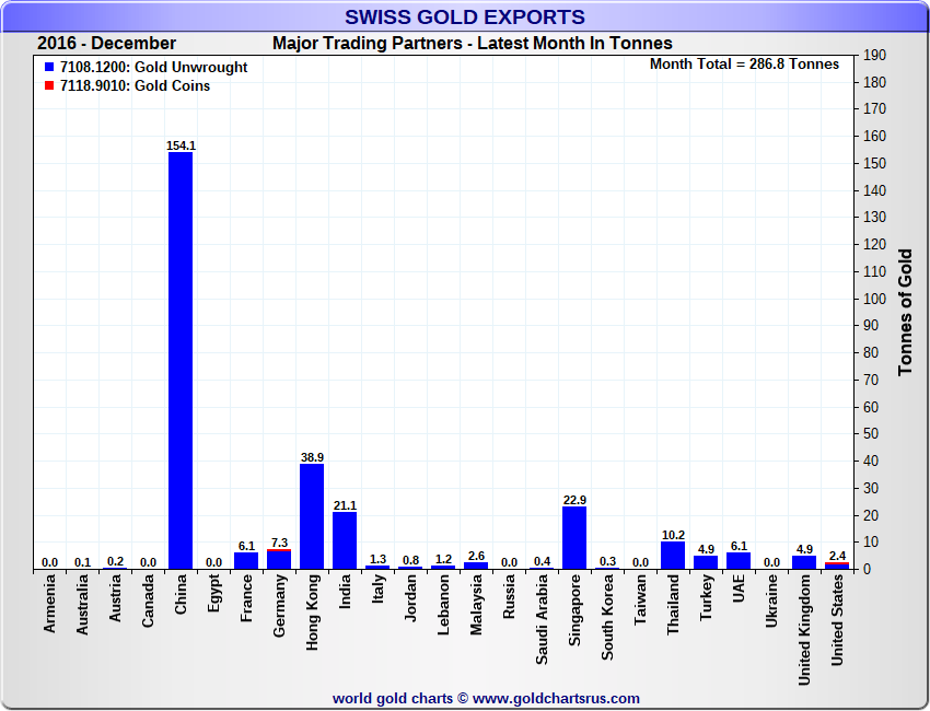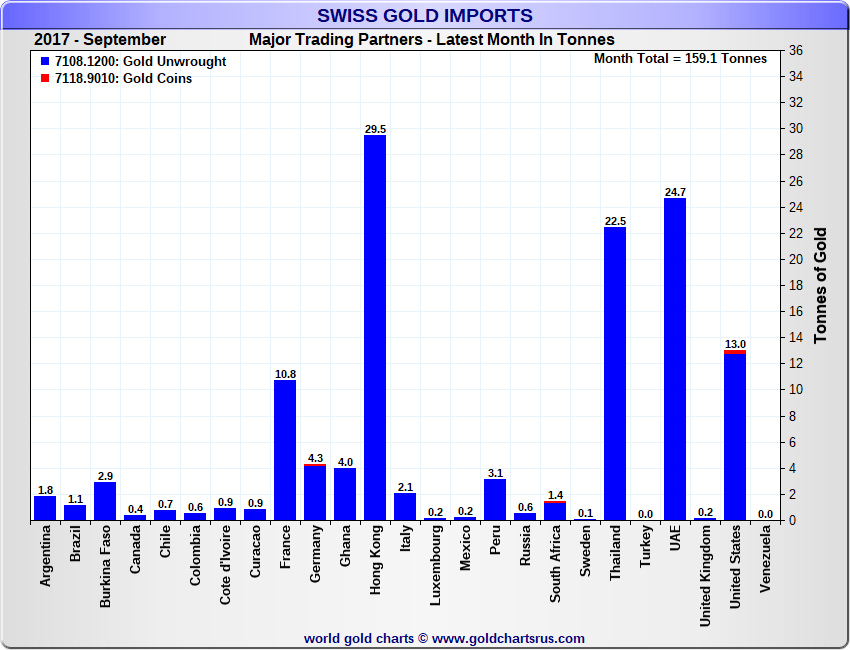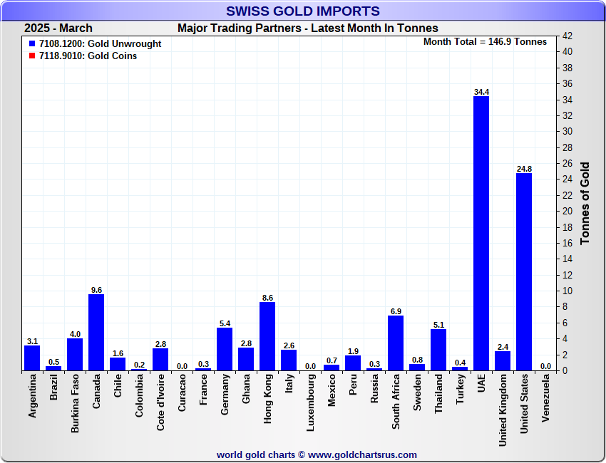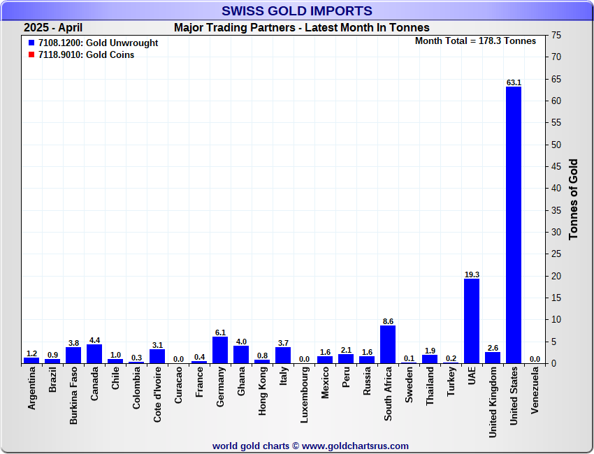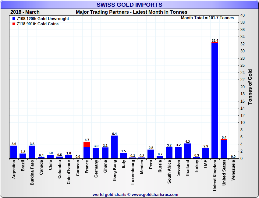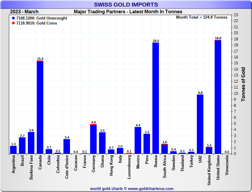 Tonnages are derived from CHF values divided by the CHF gold price. Source: Swiss Data |