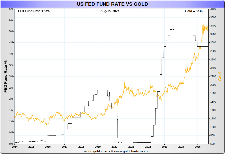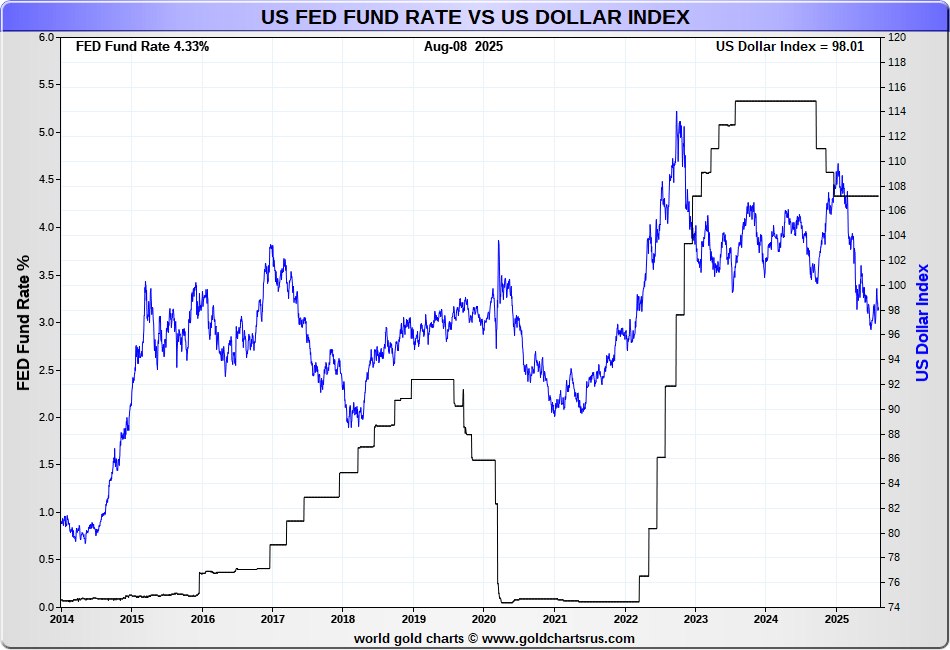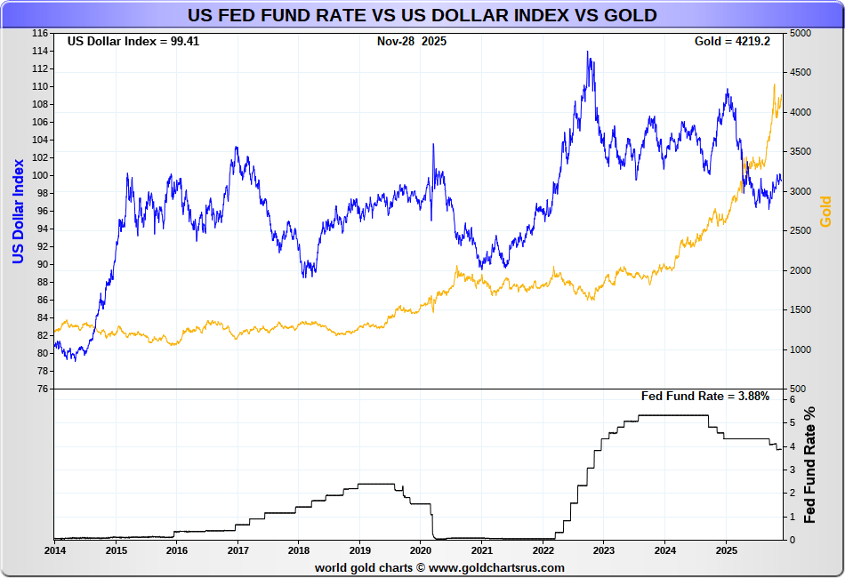 US FED FUND RATE vs US DOLLAR INDEX vs GOLD