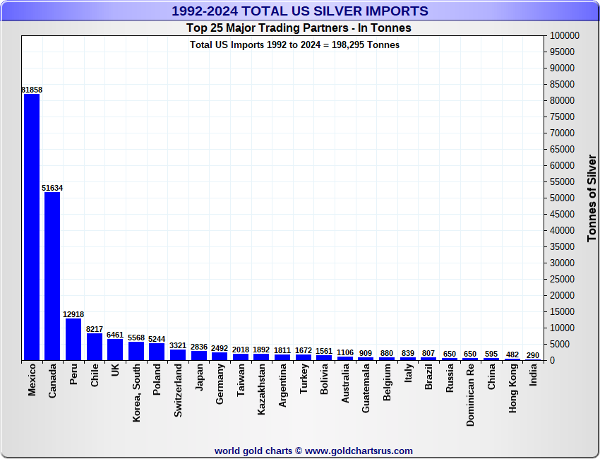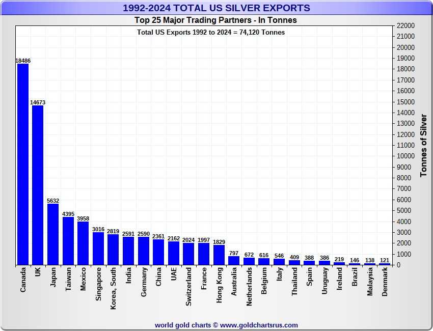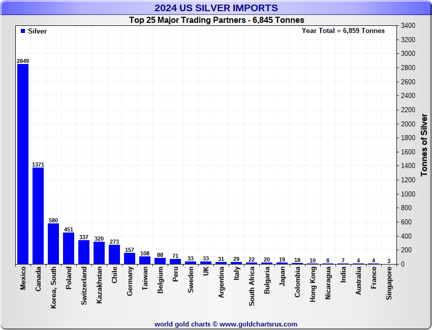 Tonnages are derived from USD values divided by the USD silver price. Source: Census |