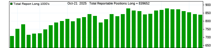 The top chart is fixed with the lower 3 panes available to show the various dataseries provided by the CFTC.