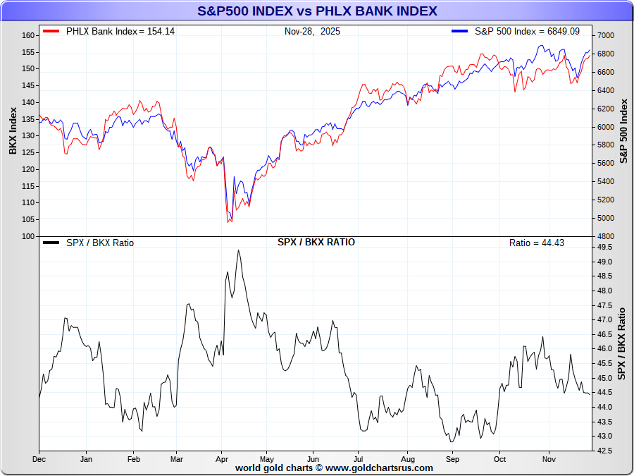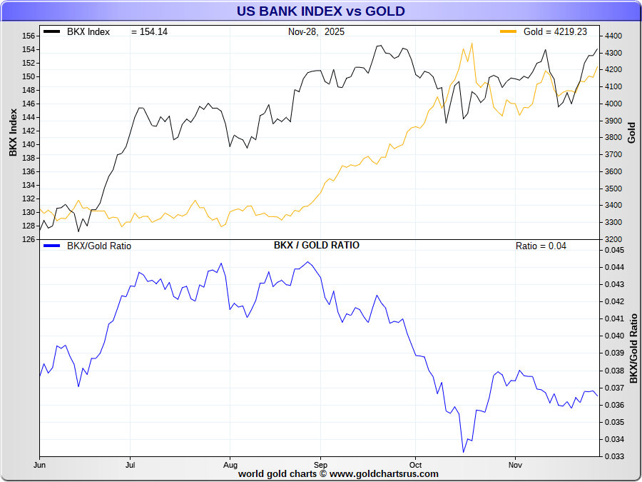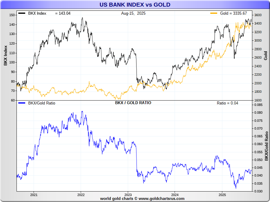 Compares strength in US banks relative to the S&P500 Index vs gold.