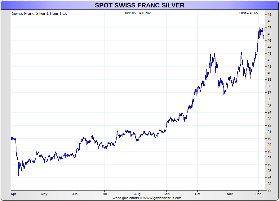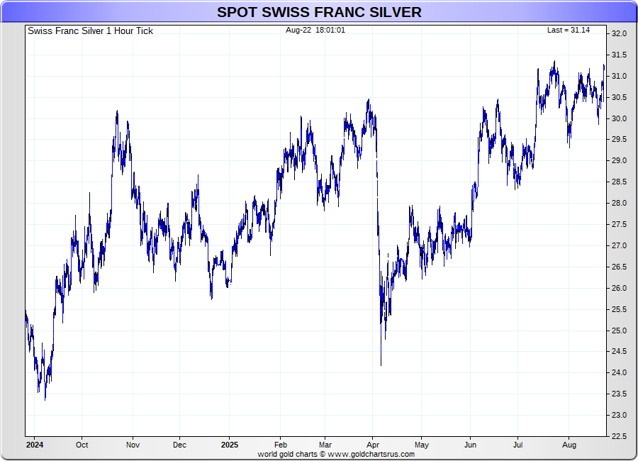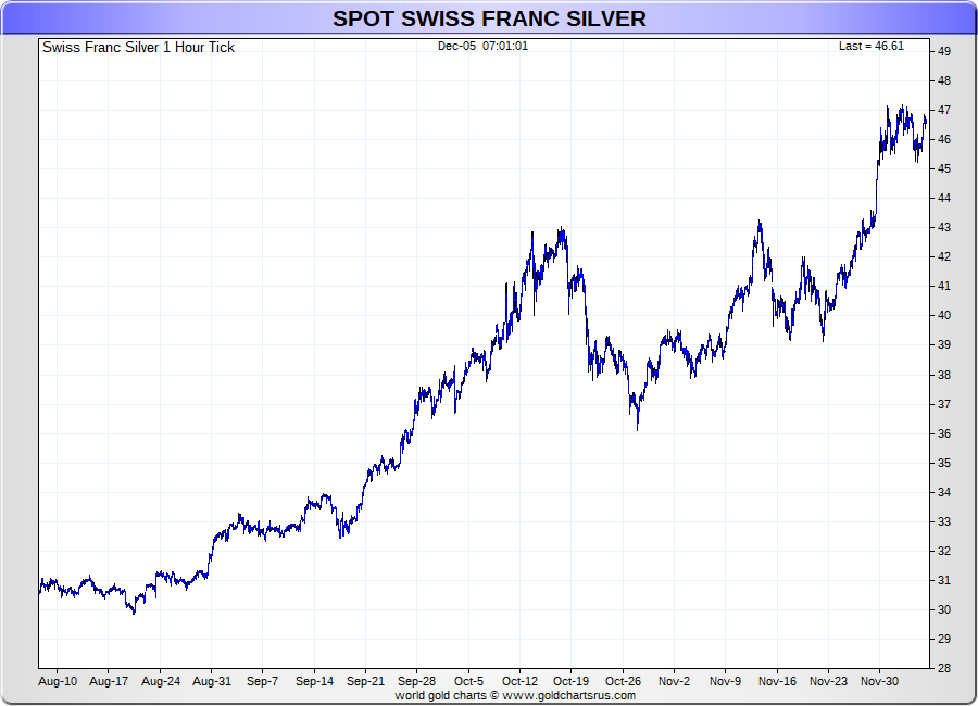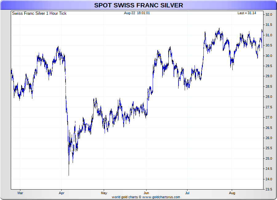 Spot Swiss Franc Silver - 60 Minute Tick Charts - 24 hours / 5 1/2 days - GCRU Precious Metals Charts